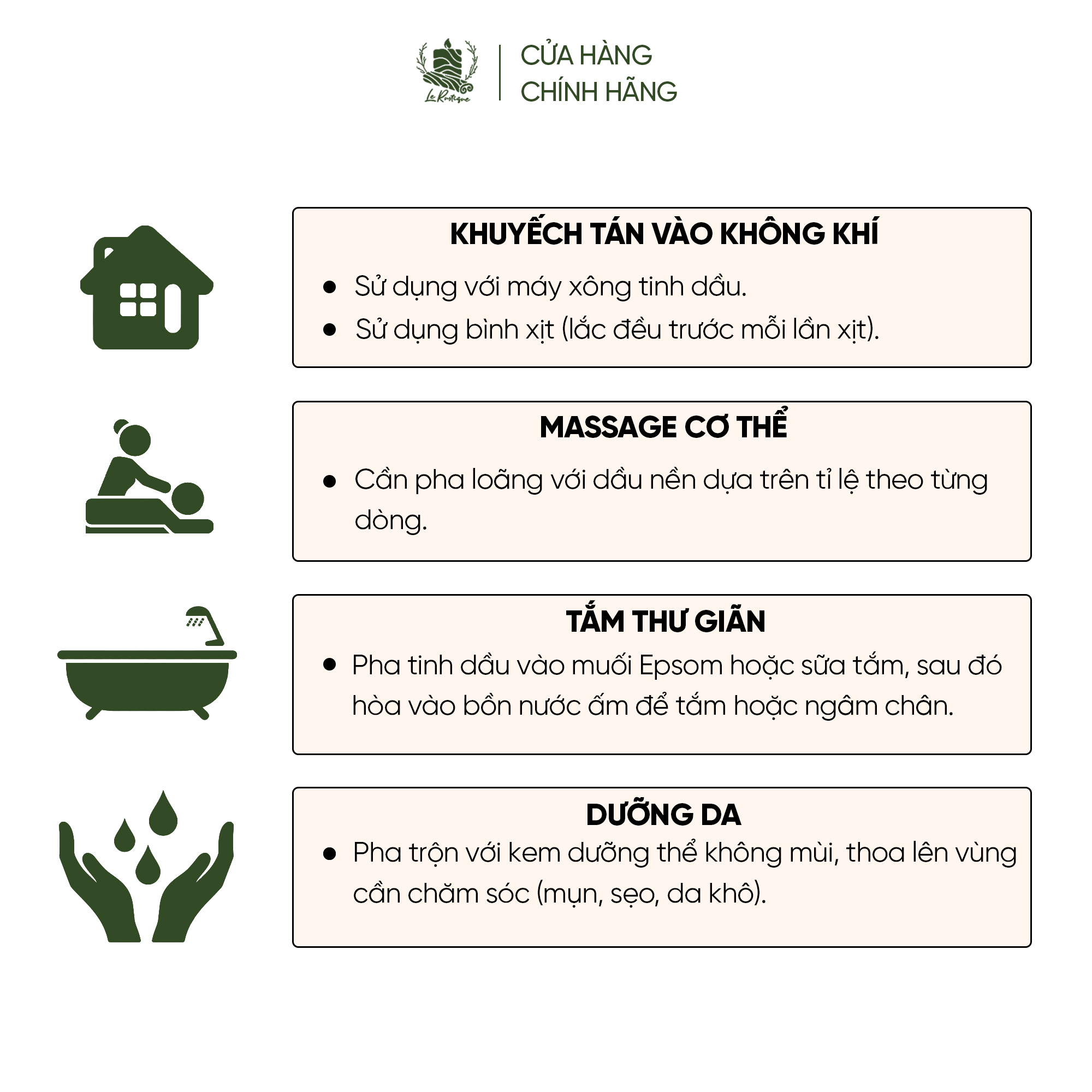 ► HƯỚNG DẪN SỬ DỤNG: Khuếch tán vào không khí bằng cách sử dụng 2-3 giọt tinh dầu cho mỗi 100ml nước hoặc sử dụng trong bình xịt. Nếu sử dụng bình xịt, cần lắc đều trước mỗi lần xịt. Nếu sử dụng máy khuếch tán, để máy ở vị trí lưu thông gió tốt để hỗ trợ khuếch tán mùi hương. Khi sử dụng trên da, cần pha loãng với nồng độ tối đa 0,16% (tương đương 4 giọt trên 125ml dầu nền - ứng với quy đổi 20 giọt bằng 1ml).