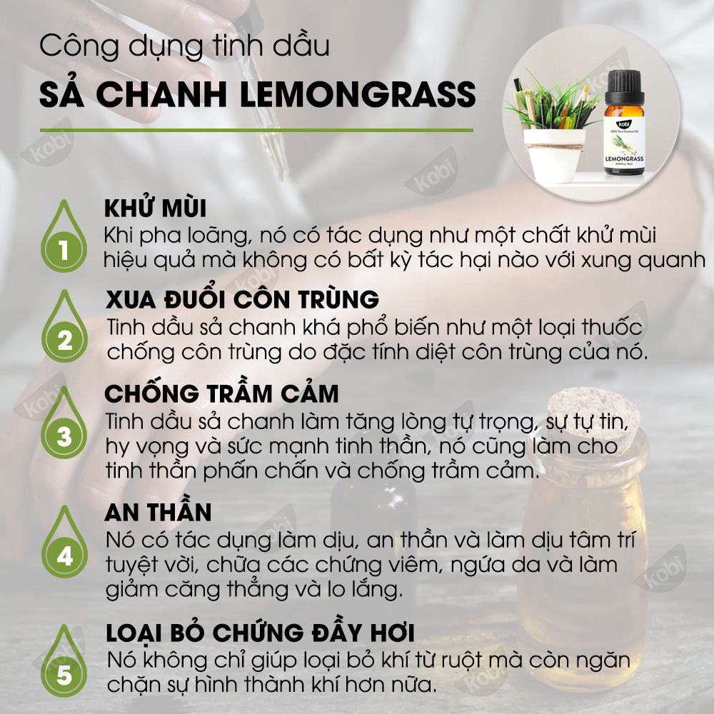 Mua tại TiktokTinh Dầu Sả Chanh Kobi (5ml) có nhiều tác dụng hỗ trợ trị đau đầu, diệt côn trùng, kích thích, sát trùng được dùng làm thuốc giải cảm, chữa đau bụng, đau dạ dày, eczema và đau nhức xương, đau cơ. Sản phẩm được sử dụng rất nhiều trong cuộc sống hàng ngày như một liệu pháp chăm sóc sức khỏe an toàn và hiệu quả.