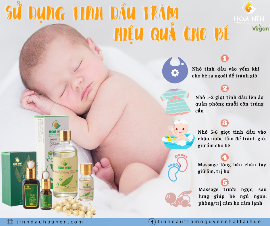 - Tinh dầu tràm phòng, giảm ho, khò khè, long đờm: Dùng tinh dầu tràm thoa vào lưng (tránh thoa trực tiếp vào xương cột sống trẻ) giúp cơ thể trẻ ấm lên một cách tự nhiên và giữ ấm lúc về đêm. Khi trẻ bị lạnh, ho thường có triệu chừng xổ mũi, nghẹt mũi, thở dốc dẫn đến kém ăn, mất ngủ. Cho ít tinh dầu tràm vào khăn sữa rồi quàng vào cổ của bé; để trước mũi cho bé hít vào (không bôi trực tiếp lên mũi) hoặc nhỏ một vài giọt tinh dầu tràm vào gối nằm của trẻ, thoa vào 2 gan bàn chân trước lúc ngủ giúp bé không bị lạnh. Dùng tinh dầu tràm để xông họng, hít mũi, sử dụng đèn xông tinh dầu, máy khuếch tán sẽ giúp bé lưu thông mũi dễ dàng. Tinh dầu tràm có tác dụng làm tan đàm nhớt, giảm ho hiệu quả và dần dần dứt hẵn.