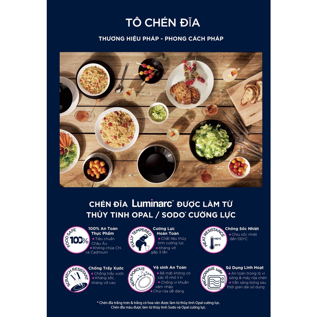 Tô thủy tinh Luminarc Diwali Black 18cm: - Kích thước: 18cm. - Chất liệu: Thuỷ tinh opal, cường lực, kháng vỡ. - Xuất xứ: Pháp. - Đặc tính nổi bật: cường lực, kháng vỡ nhiều