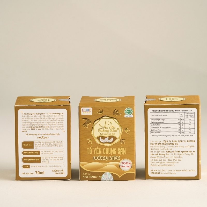 Yến Sào Hoàng Kim - Dinh Dưỡng Vẹn Nguyên Từ Thiên Nhiên, Tiện Lợi Mỗi Ngày Trong nhịp sống hiện đại, việc duy trì một chế độ dinh dưỡng cân bằng để tăng cường sức khỏe là vô cùng cần thiết. Sản phẩm Tổ Yến Chưng Sẵn Đường Phèn của thương hiệu Yến Sào Hoàng Kim là giải pháp dinh dưỡng toàn diện, kết hợp giữa phương pháp chưng cất truyền thống và công nghệ hiện đại, giúp giữ trọn vẹn dưỡng chất quý giá của yến sào. Đây là lựa chọn đáng tin cậy để chăm sóc sức khỏe cho bản thân và những người thân yêu. Điểm Vượt Trội Của Tổ Yến Chưng Sẵn Đường Phèn Hoàng Kim: Chất Lượng OCOP 4 Sao Tỉnh Khánh Hòa: Sản phẩm vinh dự được UBND tỉnh Khánh Hòa chứng nhận OCOP 4 sao năm 2024. Đây là sự bảo chứng của cơ quan nhà nước về một sản phẩm địa phương có chất lượng vượt trội và nguồn gốc rõ ràng. 100% Thành Phần Tự Nhiên, Tinh Khiết: Chúng tôi cam kết sử dụng yến sào nguyên chất , kết hợp với vị ngọt thanh của đường phèn và sự ấm nóng của gừng tươi. Sản phẩm hoàn toàn không chứa chất bảo quản, an toàn tuyệt đối cho sức khỏe. Quy Trình Sản Xuất Chuẩn Quốc Tế HACCP: Toàn bộ quy trình được sản xuất khép kín, ứng dụng công nghệ chưng hấp tiệt trùng hiện đại theo tiêu chuẩn quốc tế HACCP, giúp giữ trọn giá trị dinh dưỡng và đảm bảo vệ sinh an toàn thực phẩm. Bồi Bổ Sức Khỏe Toàn Diện: Sản phẩm là nguồn dinh dưỡng lý tưởng giúp bồi bổ cơ thể, tăng cường sức đề kháng, đặc biệt phù hợp với người lớn tuổi và người cần phục hồi sức khỏe. Thông Tin Chi Tiết Sản Phẩm: Thương hiệu: Yến Sào Hoàng Kim Xuất xứ: Việt Nam Thành phần: Nước (68g), yến sào nguyên chất (1.5g yến khô, tương đương 12.6g yến tươi), đường phèn (5.5g), gừng tươi. Đối tượng sử dụng: Người lớn tuổi, phụ nữ mang thai , người bận rộn, người có sức đề kháng kém. Hướng dẫn sử dụng: Lắc đều trước khi uống, ngon hơn khi uống lạnh. Nên dùng hết sau khi mở nắp. Hạn sử dụng: 12 tháng.