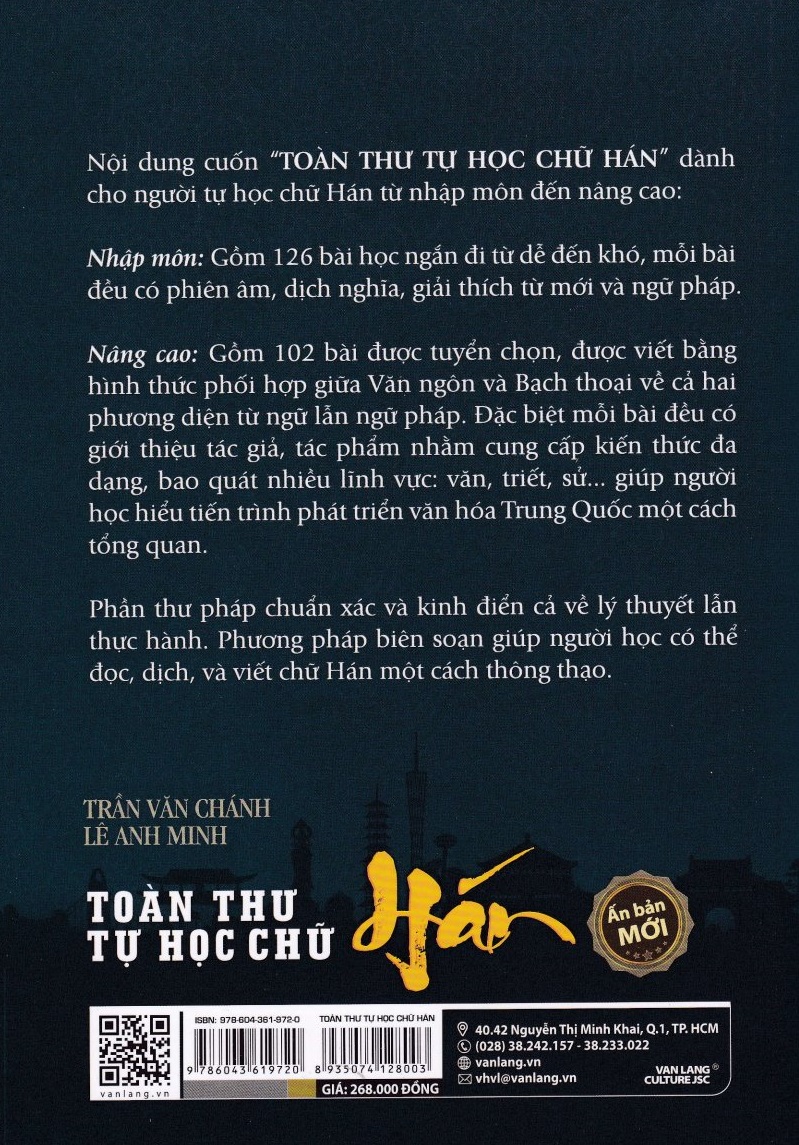 Mua tại TiktokTất cả được viết bằng một hình thức Hán ngữ khá đặc thù có tính trung gian và phối hợp giữa Văn ngôn và Bạch thoại về cả hai phương tiện từ ngữ lẫn ngữ pháp. Đặc biệt mỗi bài đều có giới thiệu tác giả, tác phẩm nhằm cung cấp một khối lượng kiến thức có tính đa dạng, bao quát nhiều lĩnh vực:Văn, Triết, Sử…giúp người học có thêm cơ hôi theo dõi tiến trình phát triển văn hóa Trung Quốc một cách tổng quan. Ngoài ra, phần thư pháp có tính chuẩn xác và kinh điển cả về lý thuyết lẫn thực hành. Phương pháp biên soạn nhằm đáp ứng những nhu cầu khác nhau tùy theo mục đích sử dụng của mỗi người, nhưng chính yếu vẫn là để giúp người học có thể đọc, dịch và viết chữ Hán một cách thông thạo.