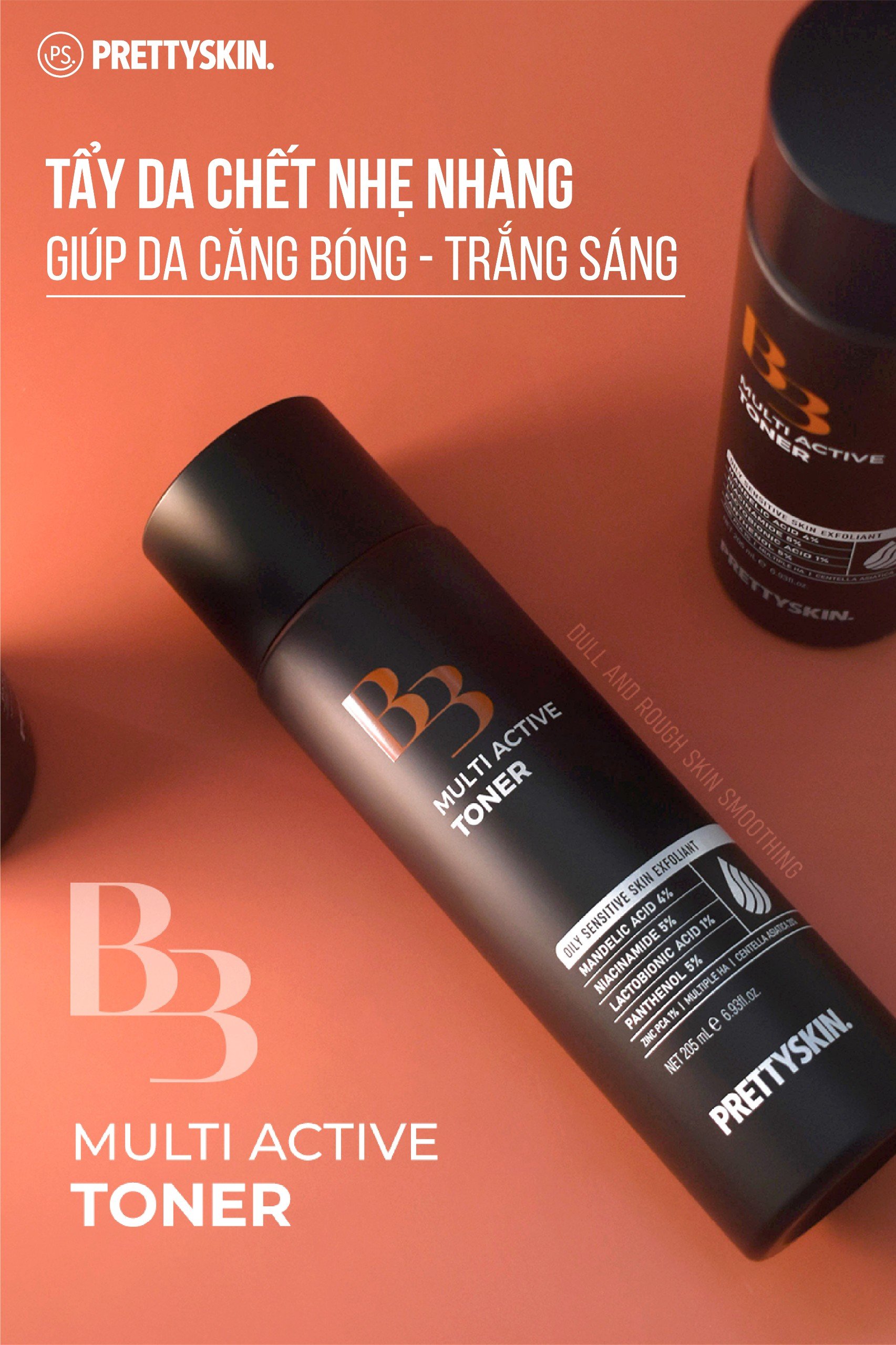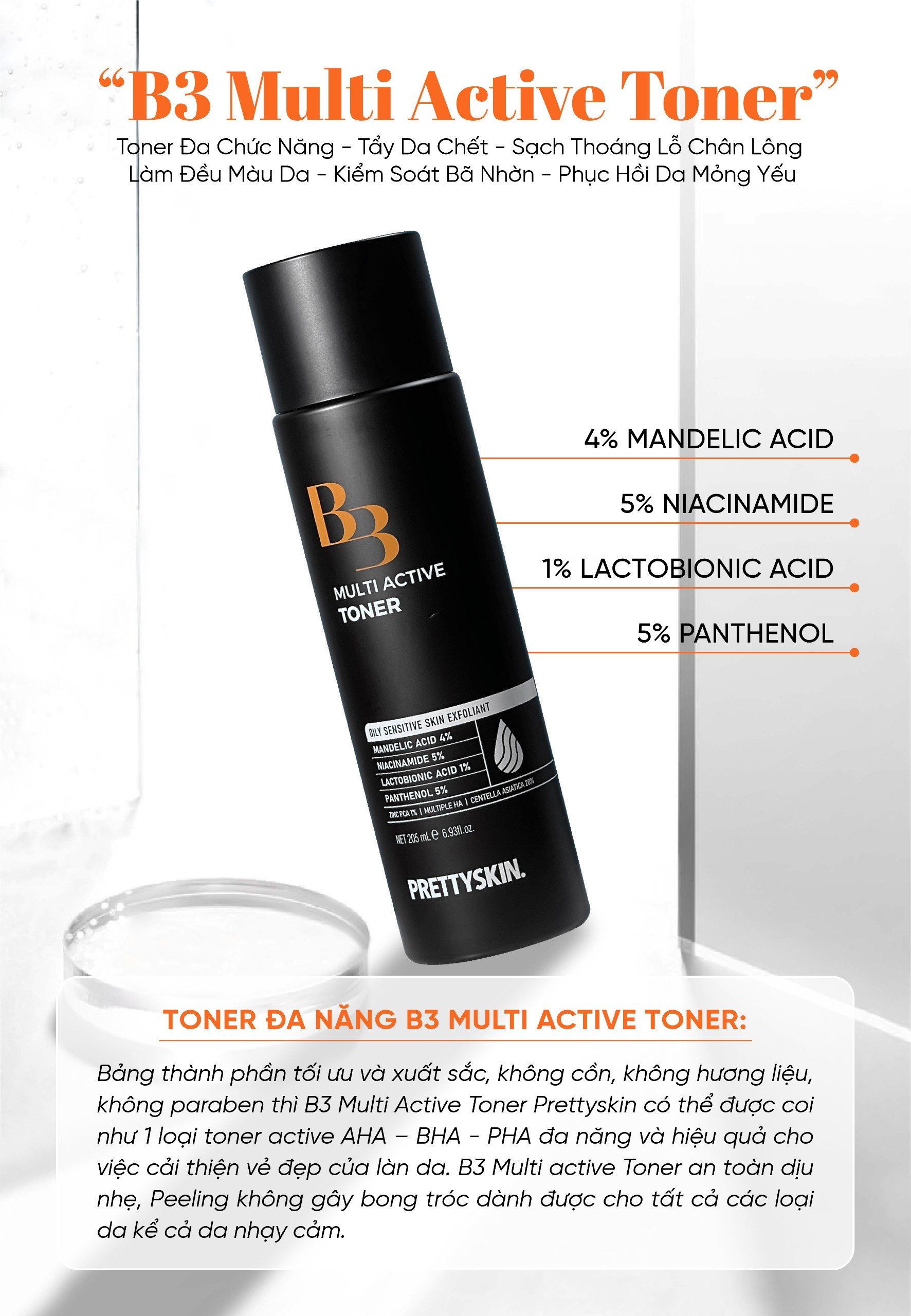 Toner đa di năng nhất hệ mặt trời - B3 Prettyskin   Tìm đâu ra 1 chiếc Toner có thể tẩy da chết một cách nhẹ nhàng lại có độ PH lý tưởng giúp cân bằng da, còn có thể kiểm soát dầu thừa, bã nhờn hiệu quả và đặc biệt chứa combo AHA-BHA-LHA loại bỏ hết cặn bẩn, bã nhờn cho da mịn màng, tươi sáng!   Mandelic Acid 4% với kích thước phân tử lớn nên không gây châm chích hoặc đỏ rát nhưng vẫn tẩy da chết hiệu quả, loại bỏ đi lớp tế bào sừng già Niacinamide 5% làm đều màu da, cải thiện các đốm sắc tố, chống oxy hóa, làm mờ thâm sẹo và se khít lỗ chân lông Lactobionic Acid 1% kích thích tăng sinh collagen, giảm sự tích tụ của melanin giúp cải thiện nếp nhăn và làm đều màu da Panthenol 5% tăng khả năng phục hồi giúp da nhanh chóng mềm mại, tràn đầy sức sống