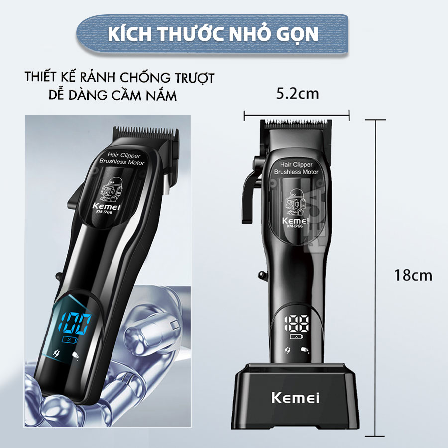 TÔNG ĐƠ CẮT TÓC CHUYÊN NGHIỆP KEMEI KM-1766 CÔNG SUẤT MẠNH 5W ĐỘNG CƠ KHÔNG CHỔI THAN, MÀN HÌNH LCD HIỂN THỊ SẠC, LƯỠI CẮT MẠ CARBON DLC CAO CẤP