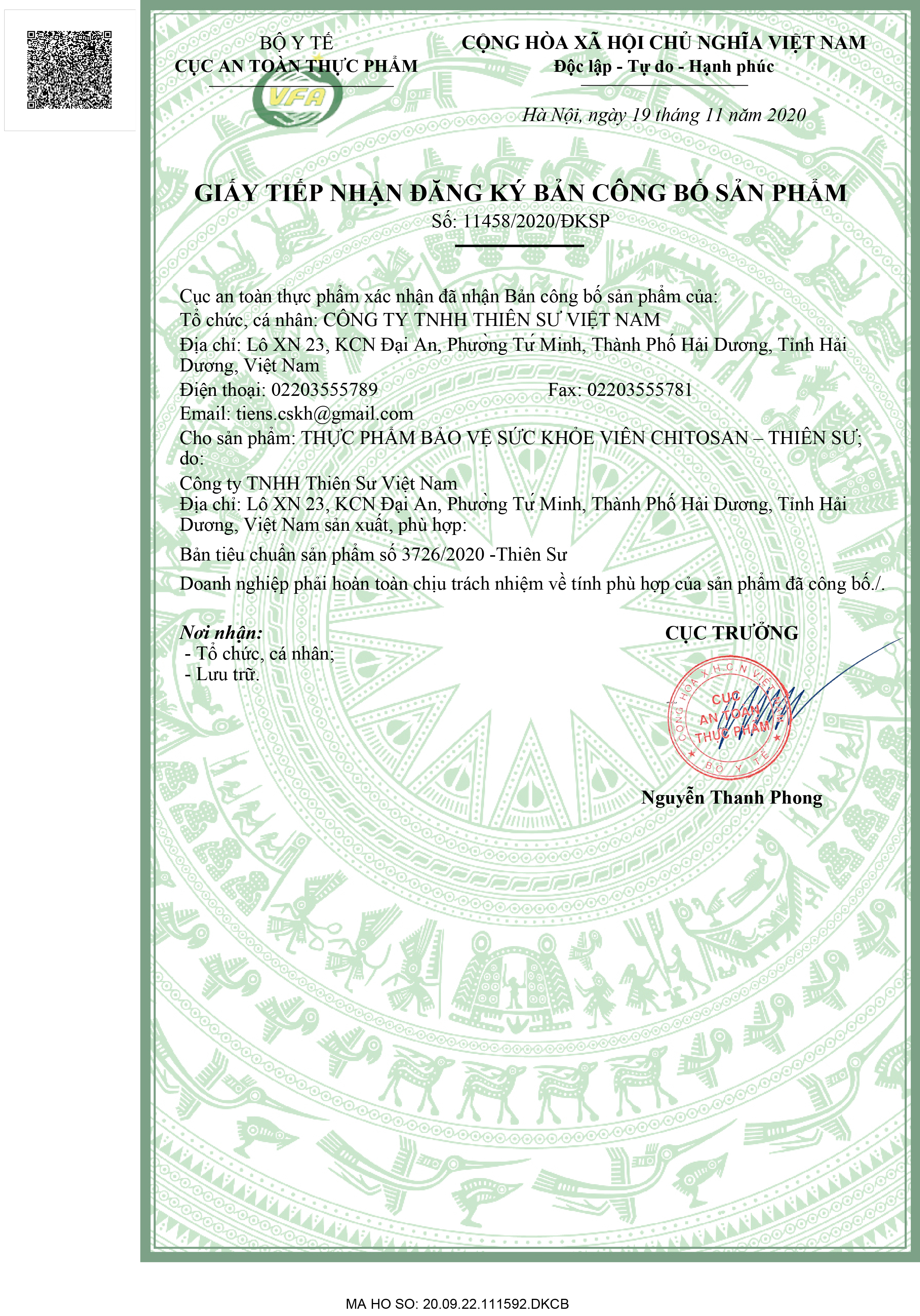 TPBVSK Viên Chitosan - Thiên Sư Quy cách: 17g (0,17g x 100 viên)/ lọ. Thành phần: Bột chitosan (chiết xuất từ vỏ cua) 82%: 170mg Công dụng: Hỗ trợ tăng sức đề kháng cơ thể, giảm hấp thụ chất béo, giảm nguy cơ béo phì Đối tượng thích hợp: Người sức đề kháng kém, khả năng miễn dịch kém, những người béo phì, mỡ máu cao.  Cách dùng: Mỗi ngày uống 2 lần, mỗi lần 2 viên với nước ấm.  Bảo quản nơi khô ráo, thoáng mát, tránh ánh náng trực tiếp Xuất xứ: Việt Nam Thực phẩm này không phải là thuốc và không có tác dụng thay thế thuốc chữa bệnh. Không sử dụng cho người mẫn cảm với bất kỳ thành phần nào của sản phẩm Không nên dùng cho trẻ nhỏ Số CBSP: 11458/2020/ĐKSP Sản phẩm của Tiens nhận được rất nhiều chứng nhận của Việt Nam và Quốc tế về chất lượng sản phẩm như : Hala , FDA của Hoa Kỳ, Chứng nhận doanh nghiệp công nghệ cao, chứng nhận hệ thống quản lý an toàn thực phẩ