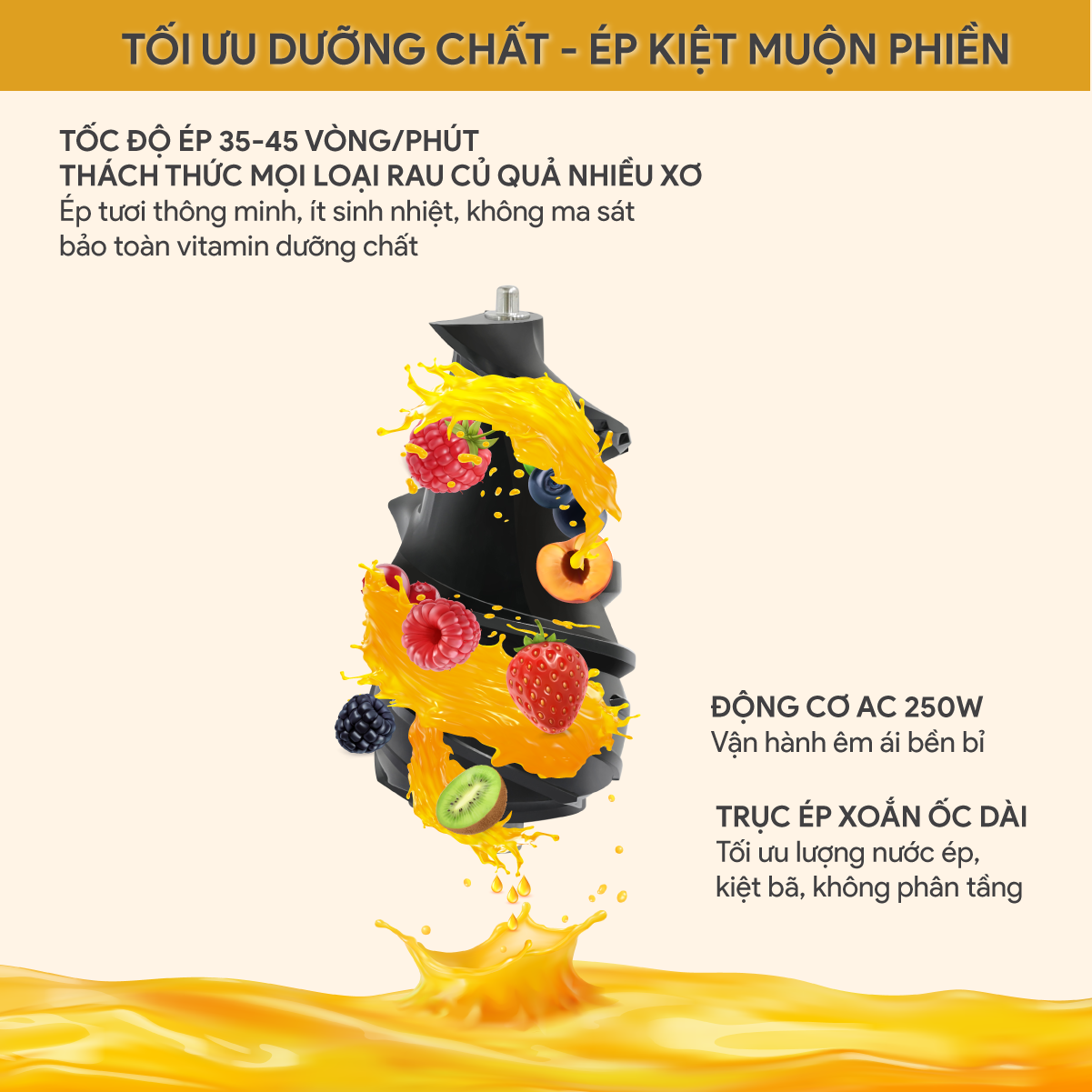 Ép với tốc độ chậm 35-45 vòng/phút, tối đa khả năng chiết xuất, bảo toàn các vitamin và dưỡng chất.
