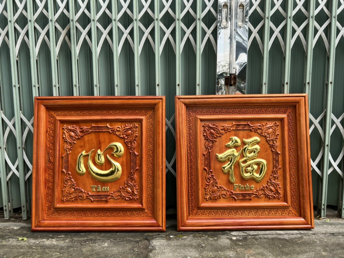 Tranh điêu khắc chữ phúc được làm bằng chất liệu gỗ hương đỏ tự nhiên 100% Kt mặt rộng 67×67×3,5cm _ Tranh điêu khắc chữ phúc vô cùng tỉ mỉ ,tinh sảo kỳ công .Đi hầu hết tất tất cả mọi chi tiết góc ngách của tranh đều được gọt tỉa chỉnh sửa sắc nét sạch sẽ ,hoàn toàn bằng tay thủ công .Đồng thời tranh được kiểm định kỹ lưỡng khắt nhe ,như cho vào thẩm sấy cho gỗ khô kiệt .Mục đích trống dập nứt vênh mo mối mọt , Kết hợp với trà nhám đánh giấy giáp nhiều nước sờ mát lạnh .Song cho vào phun lót làm bóng mờ để giữ lại mầu sắc vân gỗ tự nhiên .Cũng như sơn son dát vàng như ảnh trên .Tranh chữ phúc được làm và hoàn thiện do bàn tay khối óc tài hoa .Từ những người thợ dầy rặn kinh nghiệm ,cũng như tay nghề cao trong làng nghề truyền thống .Chính vì thế tranh chữ phúc đã đáp ứng đầy đủ mọi tiêu trí cần thiết như ( Đẹp bền rẻ ) Thẩm mỹ nghệ thuật với chất lượng tuyệt vời