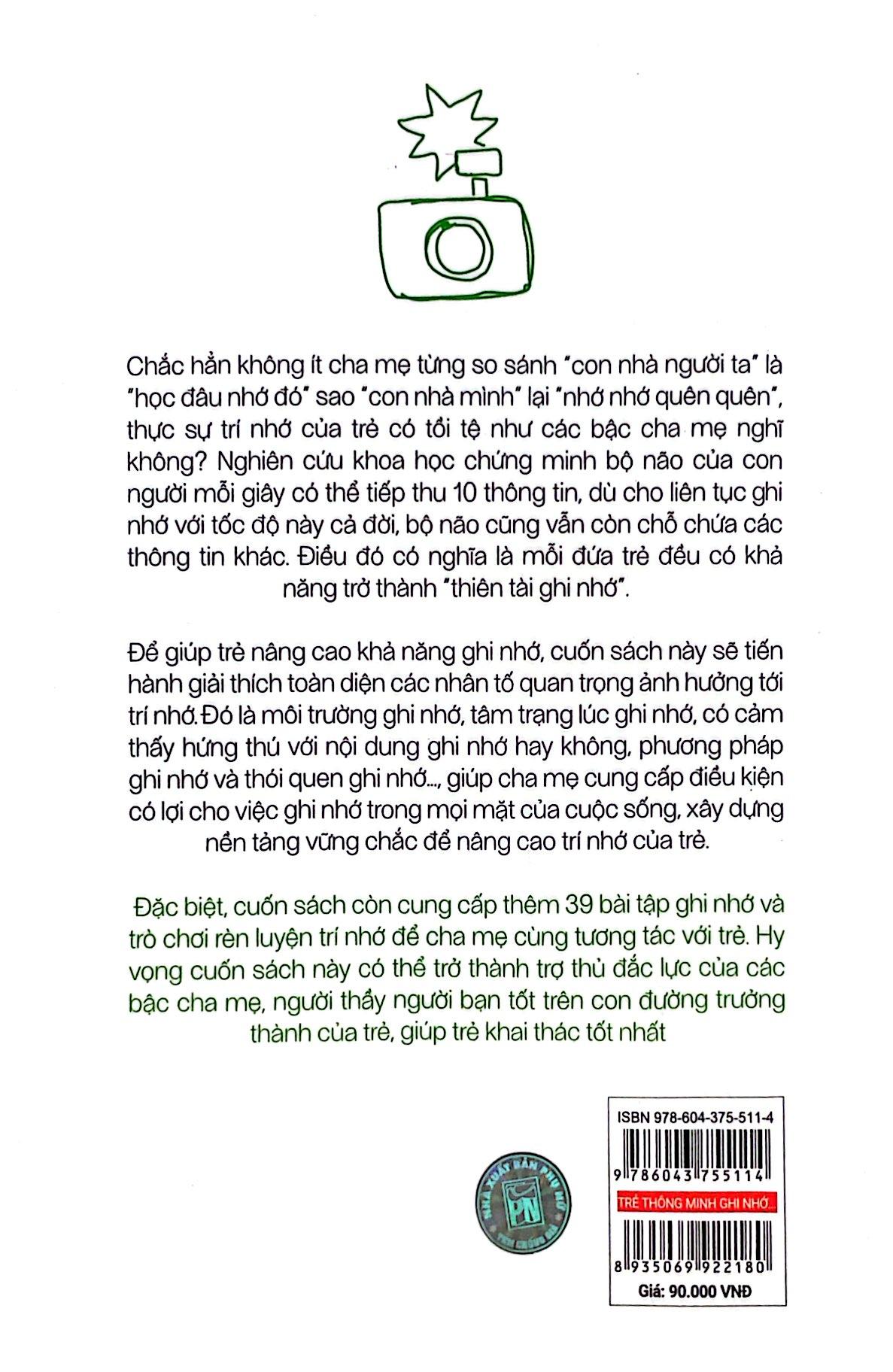 Trẻ Thông Minh Ghi Nhớ Như Thế Nào Chắc hẳn không ít cha mẹ thường so sánh" con nhà người ta "là học đâu nhớ đó sao con nhà m.ình lại nhớ nhớ quên quên ,thật sự trí nhớ của trẻ có tồn tại như các bậc cha mẹ nghỉ không ,Nghiên cứu khoa học chứng minh bộ não của con người mỗi giây có thể tiếp thu 10 thông tin dù cho liên tục ghi nhớ với tốc độ này cả đời bộ não cũng vẫn còn chỗ chứa các thông tin khác ,điều đó có nghĩa là mỗi đứa trẻ đều có khả năng trở thành thiên tài ghi nhớ. Để giúp trẻ nâng cao khả năng ghi nhớ cuốn sách này sẽ tiến hành giải thích toàn diện các nhân tố quan trọng ảnh hưởng tới trí nhớ đó là môi trường ghi nhớ tâm trạng lúc ghi nhớ có cảm thấy hứng thú với nội dung ghi nhớ hay không .Phương pháp ghi nhớ và thói quen ghi nhớ úp cho mẹ cung cấp điều kiện có lợi trong việc ghi nhớ mọi mặt cuộc sống, xây dựng nền tảng vững chắc để nâng cao trí nhớ của trẻ Đặc biệt cuốn sách còn cung cấp thêm 39 bài tập ghi nhớ và vai trò chơi rèn luyện trí nhớ ,để cho mẹ cùng tương tác với trẻ hy vọng cuốn sách này sẽ trở thành trợ thủ đắc lực của các bậc cha mẹ, người thầy người bạn tốt trên con đường trưởng thành của trẻ giúp trẻ khai thác tốt nhất .