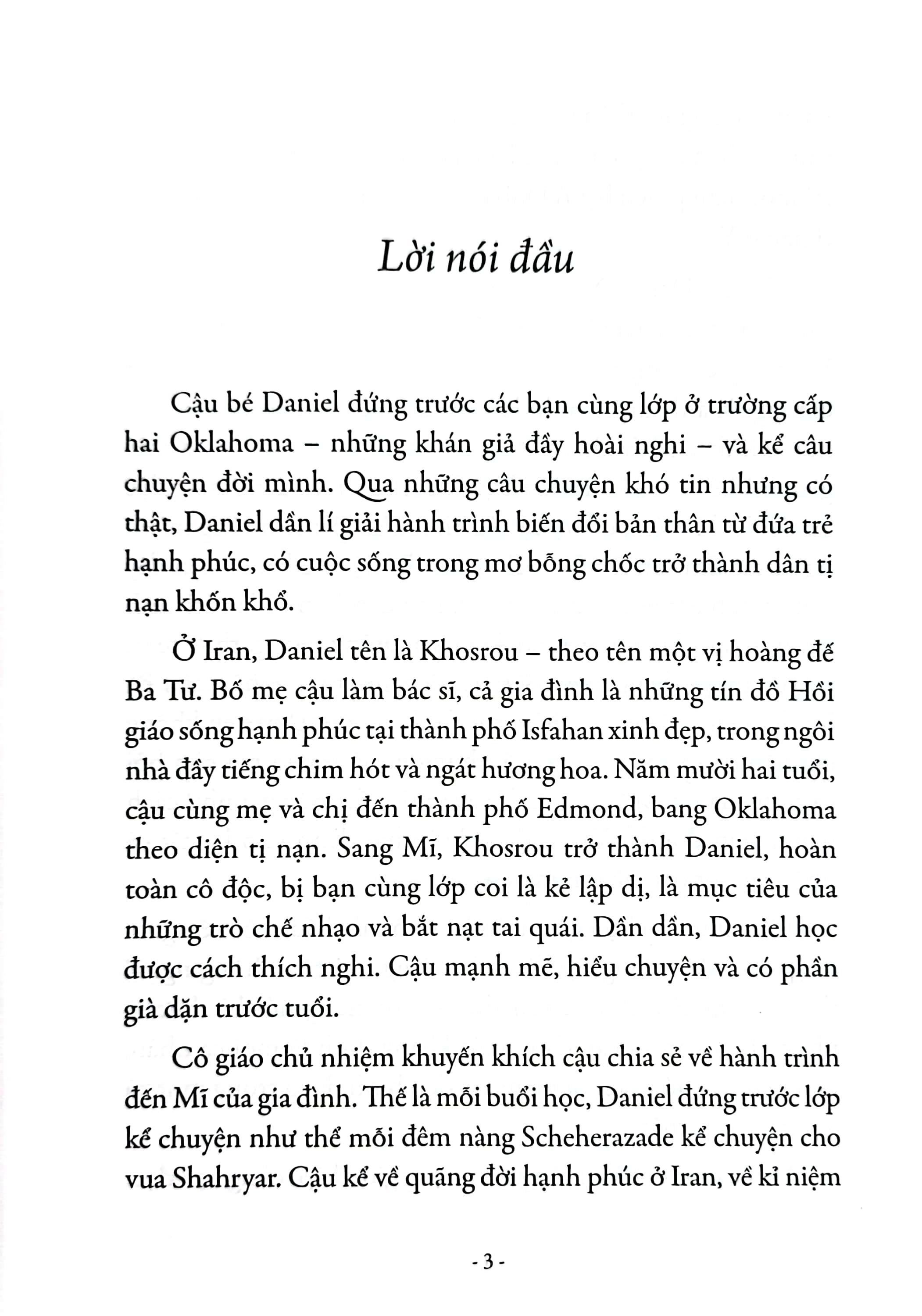 Cậu nhóc nhập cư Daniel kể chuyện đời mình và hành trình đến Mĩ theo cách nàng Scheherazade trong Nghìn lẻ một đêm mê hoặc vua Shahryar bằng truyền thuyết về Thủy thủ Sinbad, Aladdin và cây đèn thần… Những câu chuyện của cậu vừa đẹp đẽ vừa bi thương, kể từ thời điểm mẹ và chị đưa cậu bỏ trốn khỏi Iran lúc nửa đêm, ngược dòng nhiều năm, nhiều thập kỉ, thậm chí nhiều thế kỉ, về căn nhà cũ thơm hương hoa nhài tại thành phố Isfahan xinh đẹp, về cung điện của các vị vua, về vùng đất của truyện thần tiên…