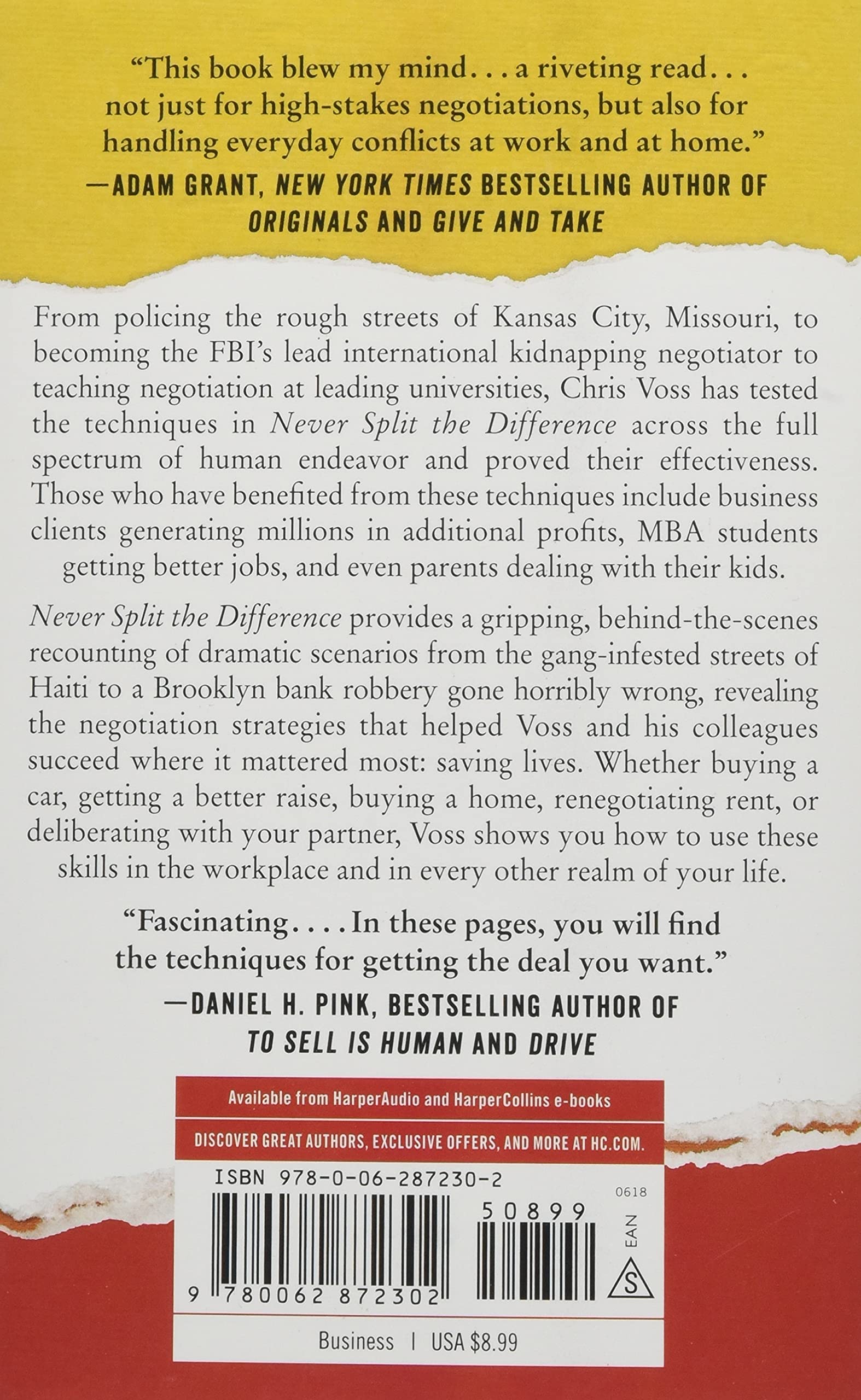 Never Split the Difference provides a gripping, behind-the-scenes recounting of dramatic scenarios from the gang-infested streets of Haiti to a Brooklyn bank robbery gone horribly wrong, revealing the negotiation strategies that helped Voss and his colleagues succeed where it mattered most: saving lives. Whether buying a car, getting a better raise, buying a home, renegotiating rent, or deliberating with your partner, Voss shows you how to use these skills in the workplace and in every other realm of your life.