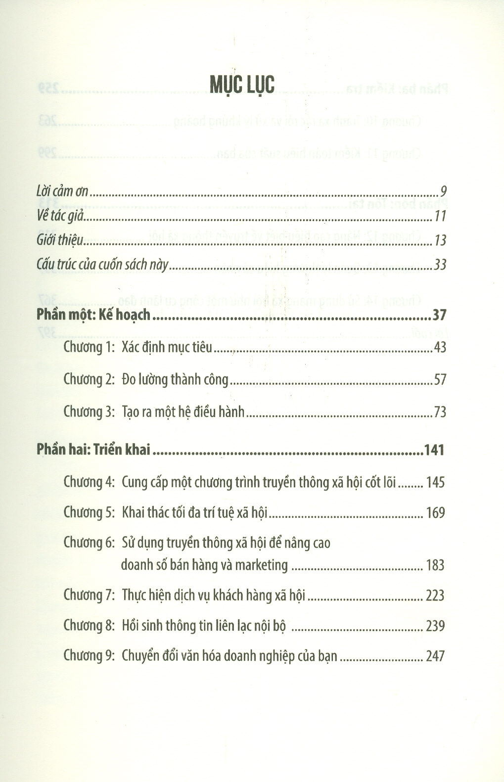 Phần Hai: TRIỂN KHAI – giải thích cách khai thác sức mạnh của truyền thông xã hội để thúc đẩy doanh nghiệp của bạn. Tôi đưa ra lời khuyên thiết thực về việc cung cấp một chương trình truyền thông xã hội cốt lõi (bao gồm nội dung, công cụ và khoản đầu tư bạn cần) trước khi chuyển sang các lĩnh vực mà tại đó, mạng xã hội có thể đóng góp đáng kể cho doanh nghiệp của bạn – trí tuệ mạng xã hội (sử dụng dữ liệu thu thập được qua quá trình lắng nghe từ mạng xã hội ); bán hàng và marketing, dịch vụ khách hàng; truyền thông nội bộ và văn hóa doanh nghiệp. Trong mỗi lĩnh vực này, việc sử dụng phương tiện truyền thông xã hội thành thạo hơn sẽ tạo ra các nguồn doanh thu mới, giảm chi phí hoạt động và tăng cường mối quan hệ với các bên liên quan chính.