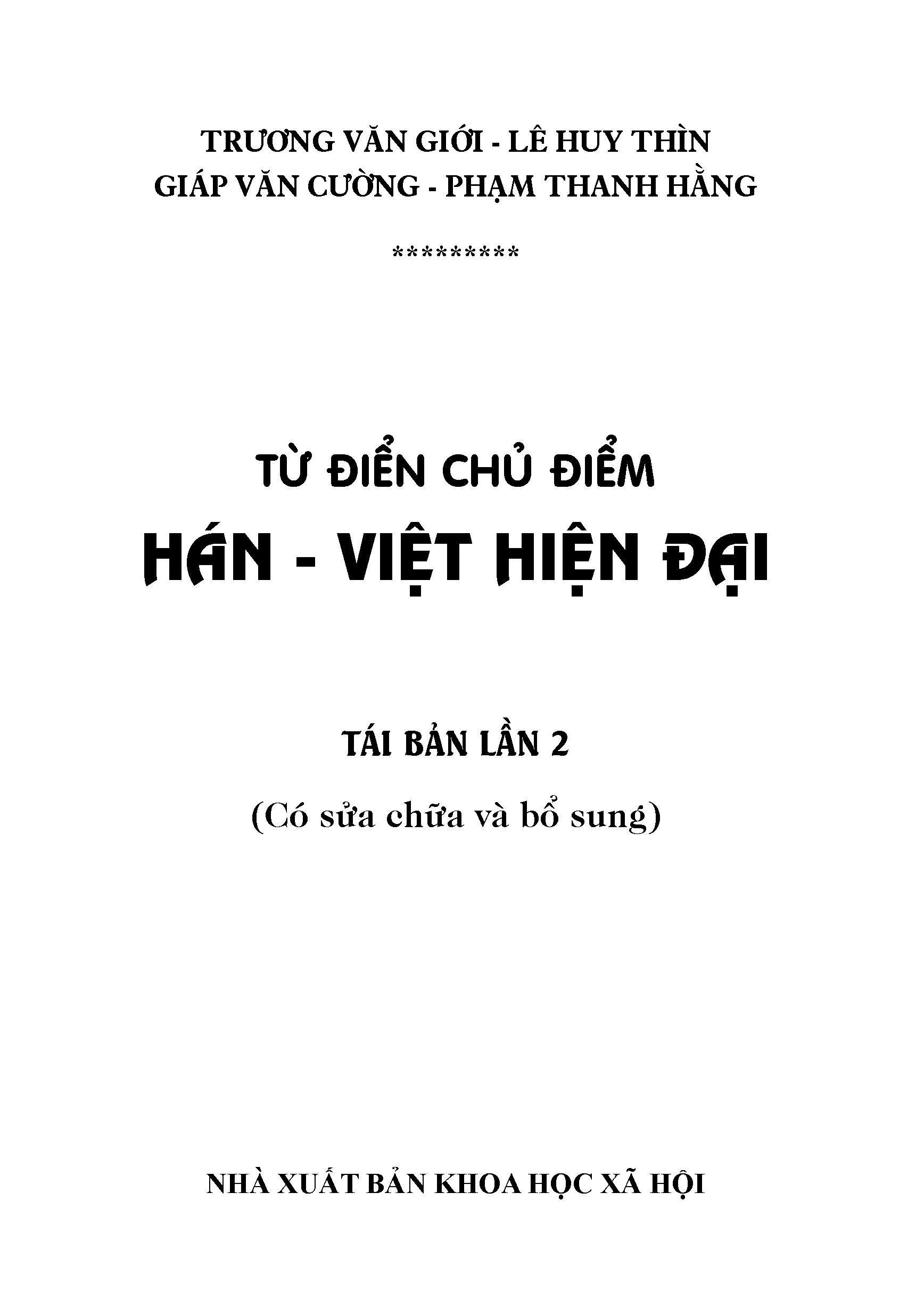 Hiện nay, tiếng Hán được dùng rộng rãi, phổ biến trong nhiều lĩnh vực xã hội, người học tập và sử dụng tiếng Hán càng có nhu cầu muốn biết những từ mới và thuật ngữ tiếng Hán thuộc từng lĩnh vực chuyên môn. Cuốn sách TỪ ĐIỂN CHỦ ĐIỂM HÁN - VIỆT HIỆN ĐẠI được xuất bản nhằm đáp ứng nhu cầu đó.