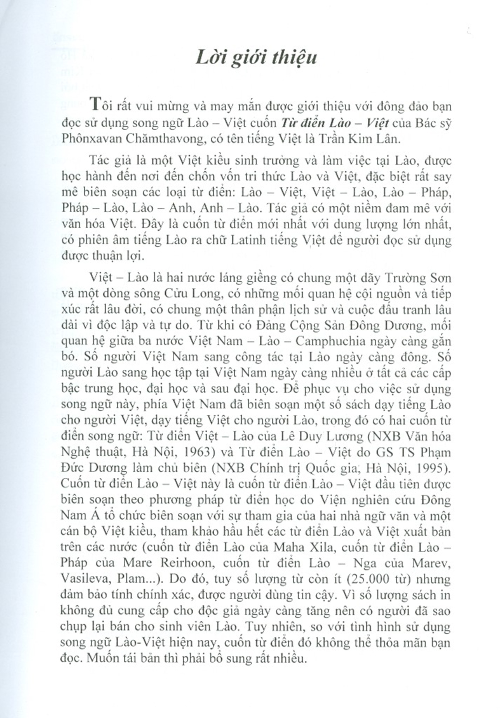 Từ xưa đến nay, cả hai nước đều có nhu cầu nâng cao và mở rộng quan hệ tốt đẹp về nhiều mặt lên một trình độ cao hơn. Để làm được điều đó, chúng ta không thể không có sự hiểu biết về ngôn ngữ của nhau. Do đó từ điển ngôn ngữ Lào - Việt, Việt - Lào với vai trò là một công cụ rất quan trọng đối với việc mở rộng giao tiếp đang được nhân dân hai nước quan tâm, nhất là học sinh, sinh viên, trí thức, các nhà nghiên cứu, các doanh nghiệp và các chuyên gia.