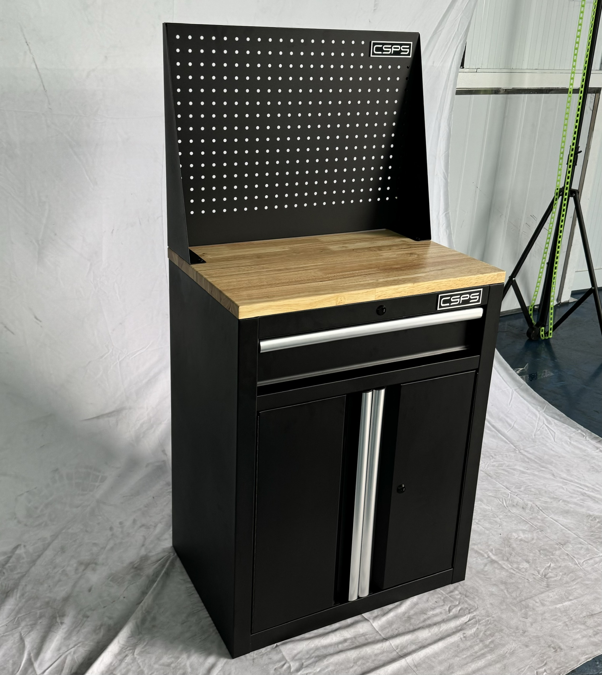 Tủ dụng cụ 61cm - 01 hộc kéo màu đen chân tăng chỉnh ván gỗ vách lưới (tay cầm trắng)