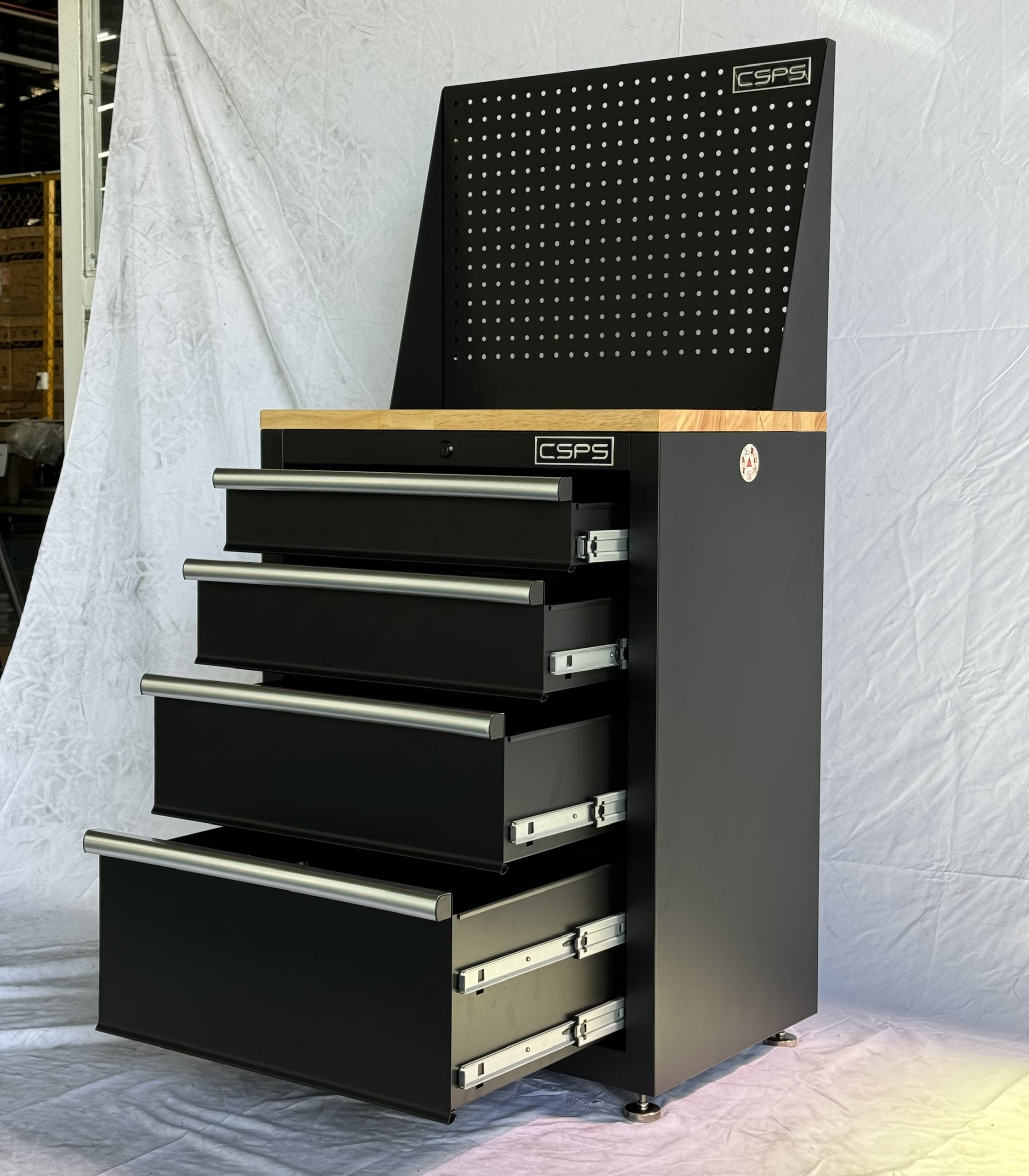 • Tủ dụng cụ CSPS 61cm - 04 hộc kéo màu đen chân tăng chỉnh ván gỗ vách lưới (tay cầm trắng)