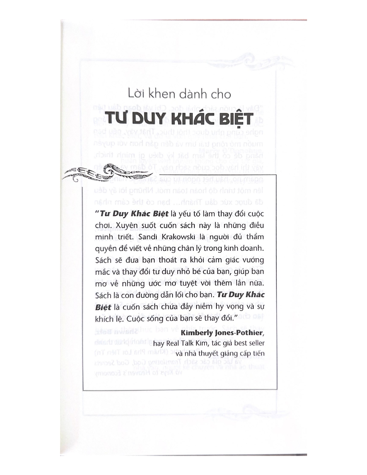 - Giới thiệu Tư Duy Khác Biệt Cuốn sách này là hành trình vượt qua những sang chấn tuổi thơ, đấu tranh chống lại khuôn khổ do người khác áp đặt, để được là chính mình, sống và hành động với lối tư duy khác biệt “không giống ai”, gặt hái thành công và trở thành ngọn lửa truyền cảm hứng cho bao người của “quý bà kỳ lân” Sandi Krakowski. Việc đưa bản ngã toàn vẹn, đích thực của bạn vào trong công việc, bao gồm cả cơ thể, tâm hồn và tinh thần sẽ mở ra cánh cửa cho bạn bộc lộ hết tiềm năng và trở nên thành công nhất có thể Trong Tư Duy Khác Biệt, Sandi Krakowski mang đến cho bạn đọc những lời khuyên sâu sắc cùng các công cụ hữu ích, dễ áp dụng để truyền lửa cho mọi người theo đuổi ước mơ, thể hiện tiềm năng và không bỏ quên bất kỳ phần nào trong tâm hồn mình trong hành trình này. Qua mỗi trang sách, Sandi chỉ người đọc cách đập tan những tiếng nói hoài nghi, cả trong đầu ta lẫn ở thế giới ngoài kia, chống lại cơ chế đang cố gắng kìm hãm ta, đồng thời tìm thấy sự phát triển không giới hạn xuất phát từ việc lựa chọn niềm tin, thay vì nỗi sợ.