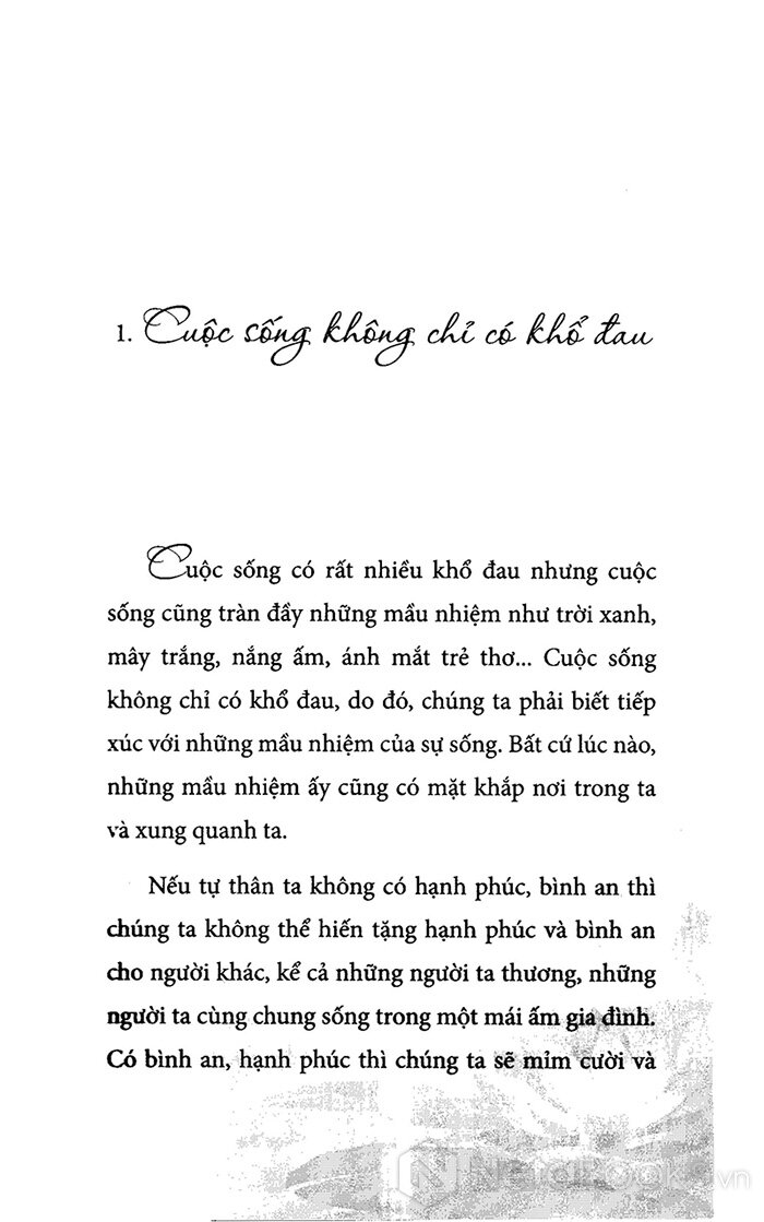 Tôi đọc ngay những dòng đầu tiên và phải đọc đi đọc lại vài lần những dòng những chữ của thiền sư Thích Nhất Hạnh "Nếu tự thân ta không có hạnh phúc, bình an thì chúng ta không thể hiến tặng hạnh phúc và bình an cho ai được, kể cả những người ta thương, những người ta cùng chung sống trong một mái ấm gia đình. Có bình an, hạnh phúc thì chúng ta sẽ mỉm cười và xinh tươi như một bông hoa, khi đó, mọi người chung quanh ta, từ gia đình cho đến xã hội, ai cũng được thừa hưởng."