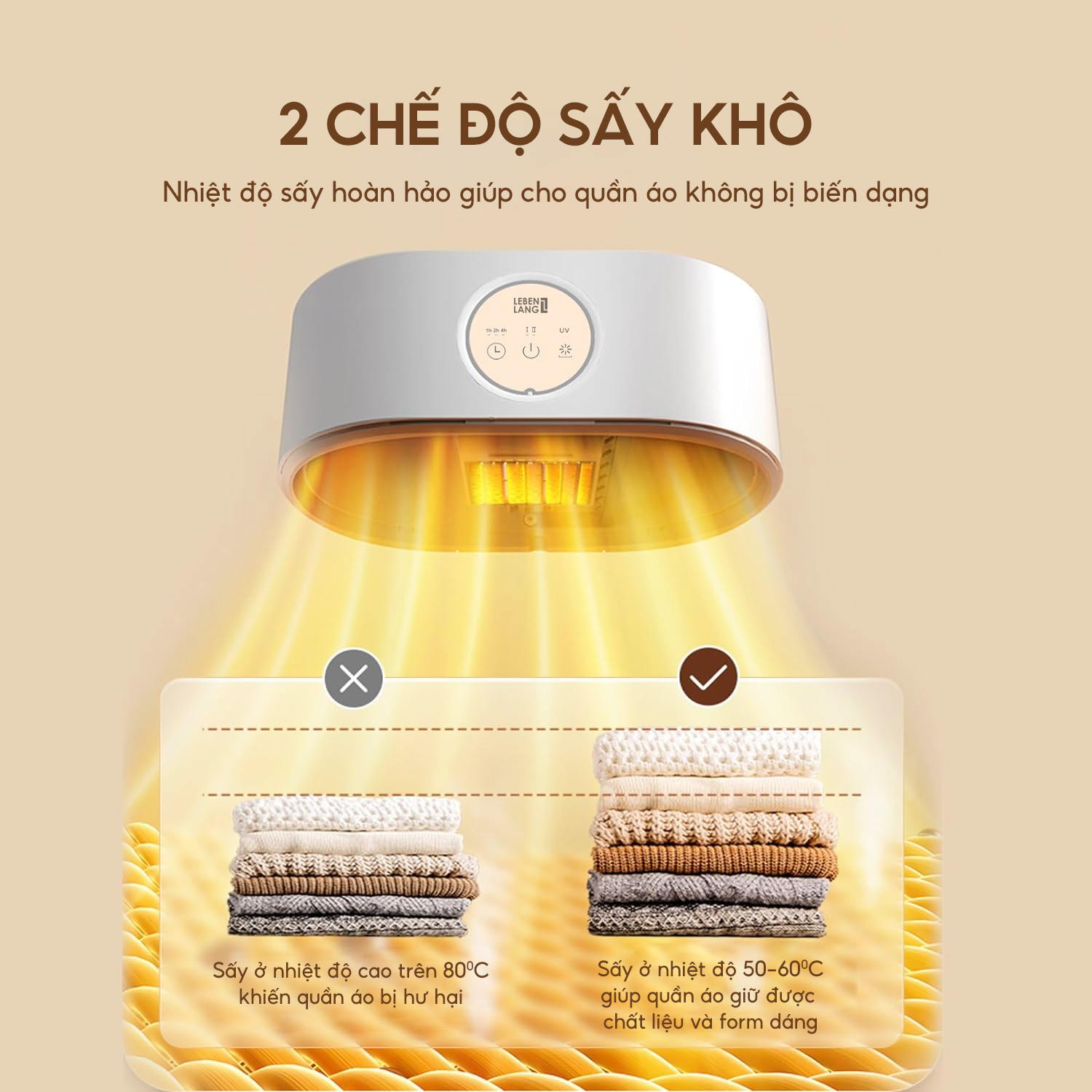 Máy sấy quần áo 2GOOD GB10 2 Chế độ Sấy Nóng - Lạnh riêng biệt: Sấy nóng đến 65 độ C, giúp quần áo khô ráo chỉ từ 1-2 giờ. Sấy lạnh giúp bảo