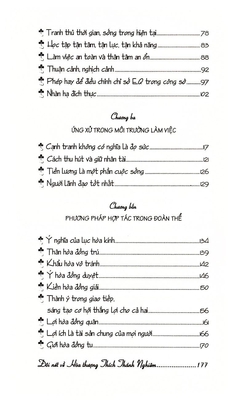 Trong cuốn sách này, Hòa thượng Thích Thánh Nghiêm chia sẻ về việc ứng dụng trí tuệ của giáo lí Phật giáo vào đời sống, nói rõ cho chúng ta biết về ý nghĩa của công việc, nghệ thuật làm việc, phương pháp ứng xử trong giao tiếp cũng như một số nguyên tắc hợp tác đoàn thể, đề xuất quan điểm tìm việc theo tinh thần “tùy thuận nhân duyên” để giảm bớt áp lực trong quá trình tìm kiếm việc làm, lấy “cạnh tranh lành mạnh” thay thế cho cạnh tranh một mất một còn mang đậm “động vật tính”; lấy “nghệ thuật chỉnh dây đàn” theo tinh thần trung không rơi vào cực đoan để giữ thăng bằng tâm lí trong cuộc sống. Cuối cùng, Ngài còn đưa ra sáu nguyên tắc chung sống hòa thuận, đó cũng là những nguyên tắc đã giúp đức Phật “thống lí đại chúng (thống lĩnh và quản lí đại chúng) thích hợp.”