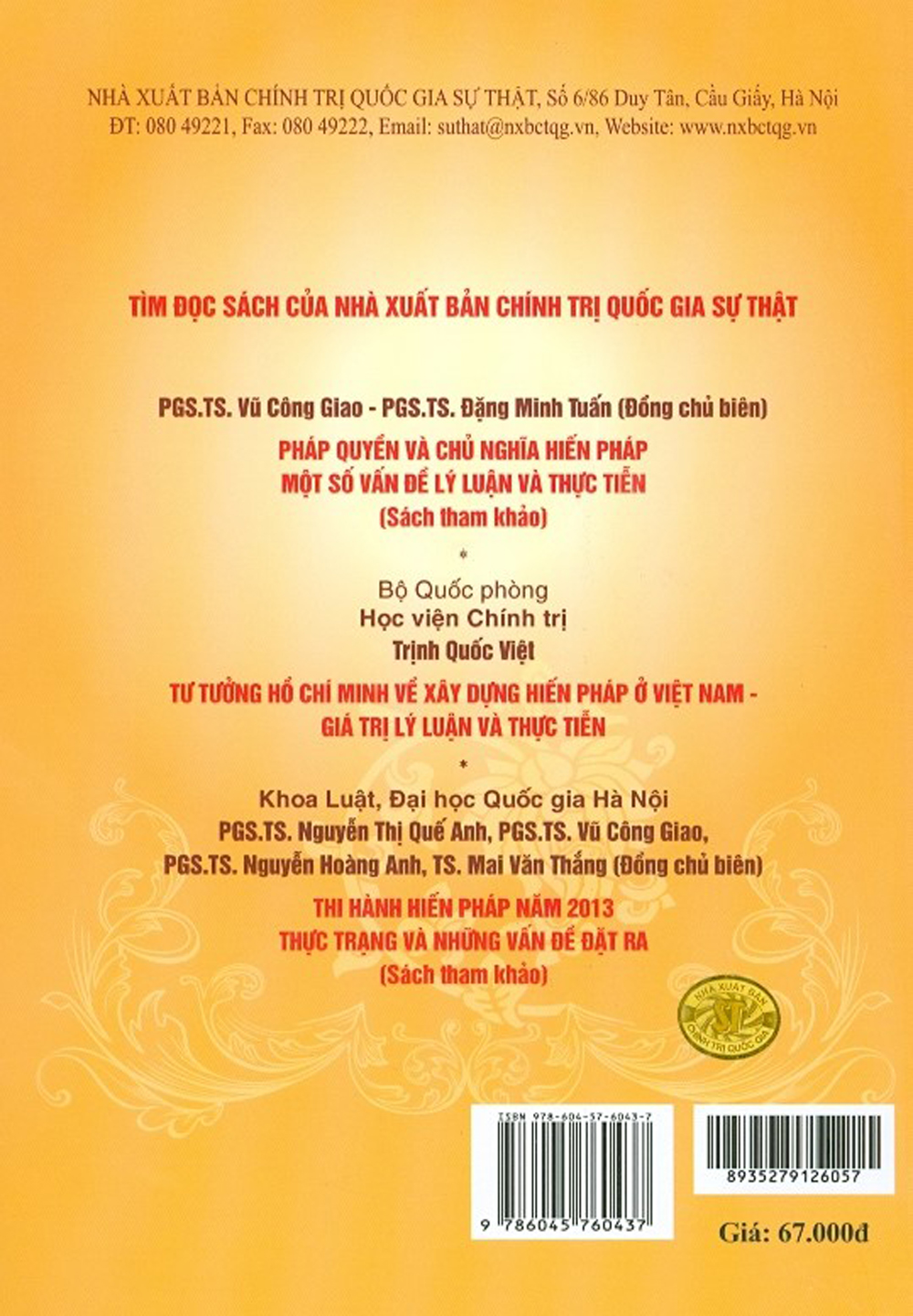 Cuốn sách còn giúp bạn đọc có cái nhìn sâu sắc, toàn diện về tư tưởng lập hiến Hồ Chí Minh. Hiến pháp 2013 là kết quả của sự kế thừa, vận dụng và phát triển các quan điểm về lập hiến của Hồ Chí Minh trong điều kiện hiện nay.
