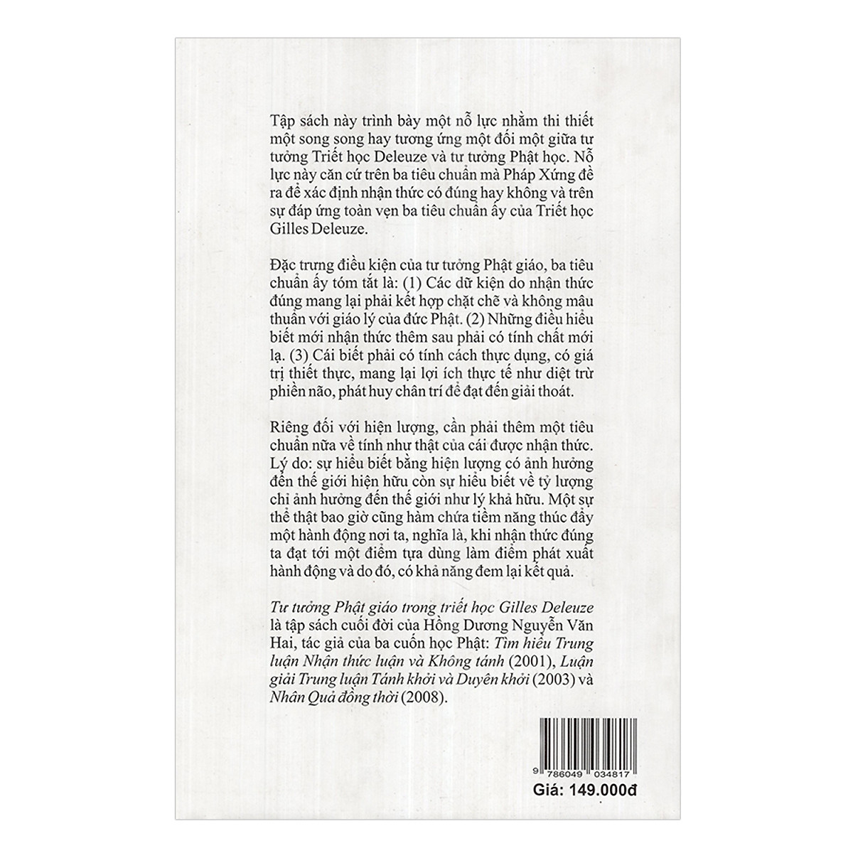 Tập sách trình bày một nổ lực nhằm thi thiết một song song hay tương ứng một đối một giữa tư tưởng Triết học Deleuze và tư tưởng Phật học nổ lực này căn cứ trên ba tiêu chuẩn mà Pháp Xứng đề ra để xác định nhận thức có hay không và trên sự đáp ứng toàn vẹn ba tiêu chuẩn ấy của Triết học Gilles Deleuze.