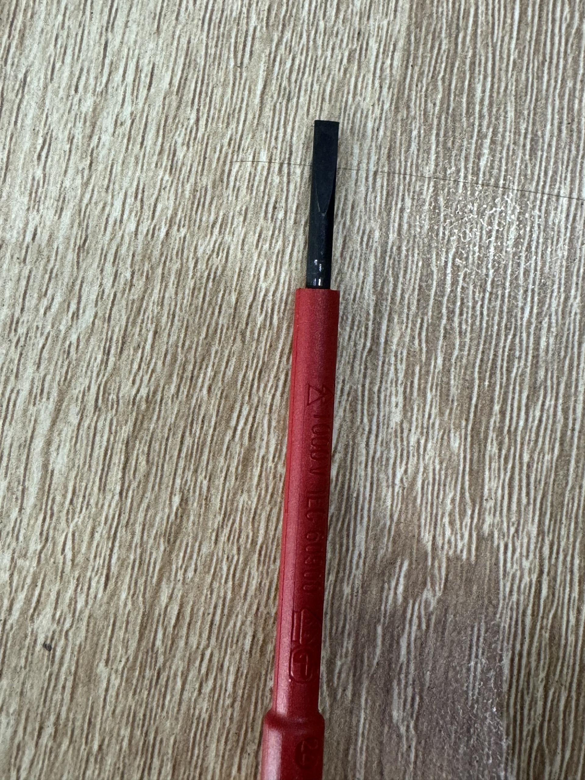 English name:Screwdriver SoftFinish electric Tiêu chuẩnĐược thử nghiệm theo IEC 60900.Ứng dụng Đối với công việc trong khu vực của các bộ phận sống lên đến 1.000 V AC. Size: 2,5 mm Chiều dài: 179