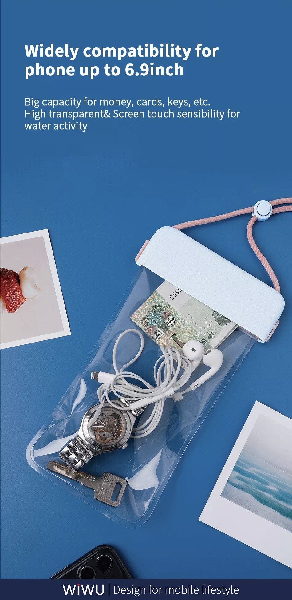 Túi chống nước waterproof cao cấp cho điện thoại 6.9 inch trở xuống chuẩn chống nước IPx8 hiệu WIWU Aqua không ảnh hưởng chất lượng ảnh chụp quay video của camera, cảm ứng nhạy, khả