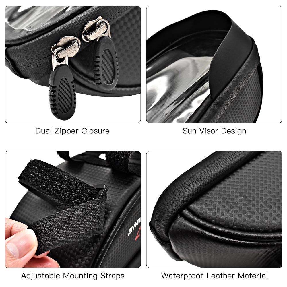 This bike top tube bag is made of PU material and sealed zipper closure to protect your items from rain drops. It features TPU touchcreen phone case, sun visor, earphone port, reflective elements and many more highlights to make the bag a perfect choice for those who love cycling. Features: Durably made with PU material, weather-resistant and easy to wipe clean. Thick lining protects your valuables from impacts. TPU touchscreen window is designed for phone screen size up to 6.5 inches. Sun visor designed for easy reading in sunny days. Sealed double zipper closure stops water from flowing into the bag. Adjustable adhesive mounting straps for easy installation on your bike. Enough inside room for phone, energy gel, mini torch, repair kits, keys, wallet, etc.