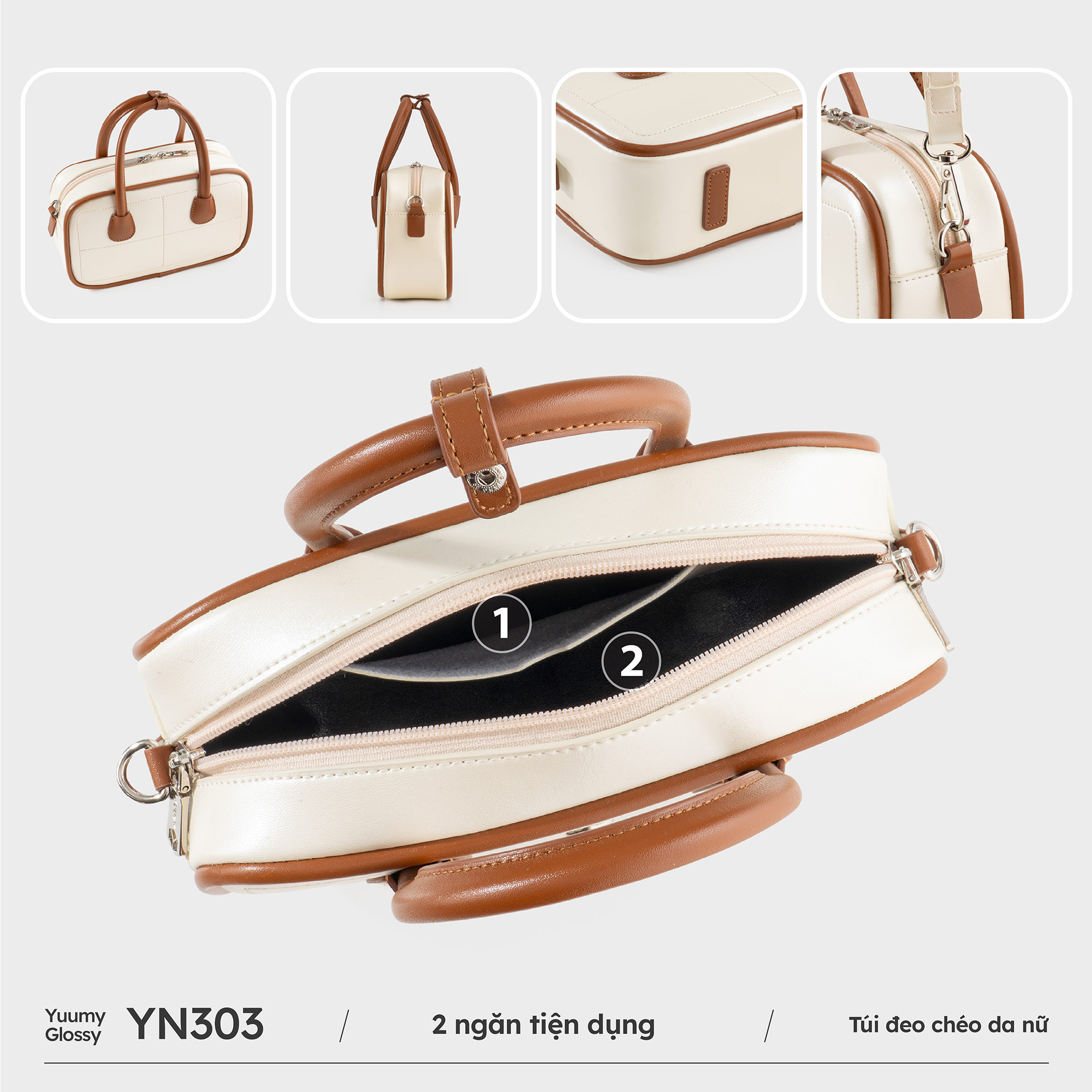 Túi đeo chéo da Yuumy Glossy YN303 với form hộp nhỏ gọn, bo góc mềm mại và đường chỉ may chia ô đối xứng, sản phẩm tạo cảm giác chỉn chu và thời trang trong