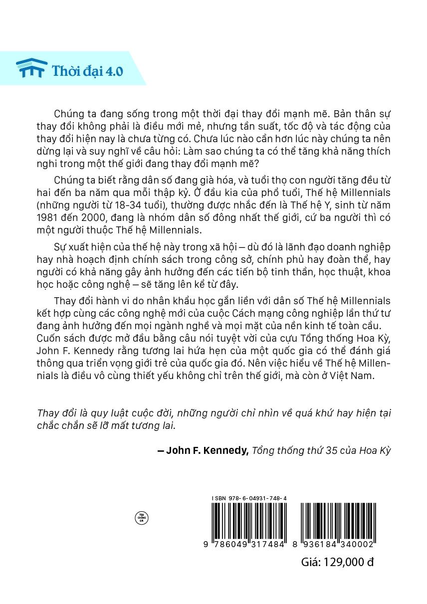 Mười chương sách là những phân tích ảnh hưởng của Thệ hệ Millennials đến các mặt dân số, kinh tế, lực lượng lao động, công nghệ, truyền thông thay đổi của xã hội trong bối cảnh Cách mạng công nghiệp lần thứ tư. Kết quả phân tích, số liệu nghiên cứu trong sách sẽ là nguồn thông tin hữu ích cho các chủ doanh nghiệp, lãnh đạo, người làm chuyên môn và những người trẻ trong công cuộc khám phá, phân tích xu thế phát triển của xã hội cũng như hiểu hơn về Thế hệ Millennials cũng như cuộc Cách mạng công nghiệp 4.0.