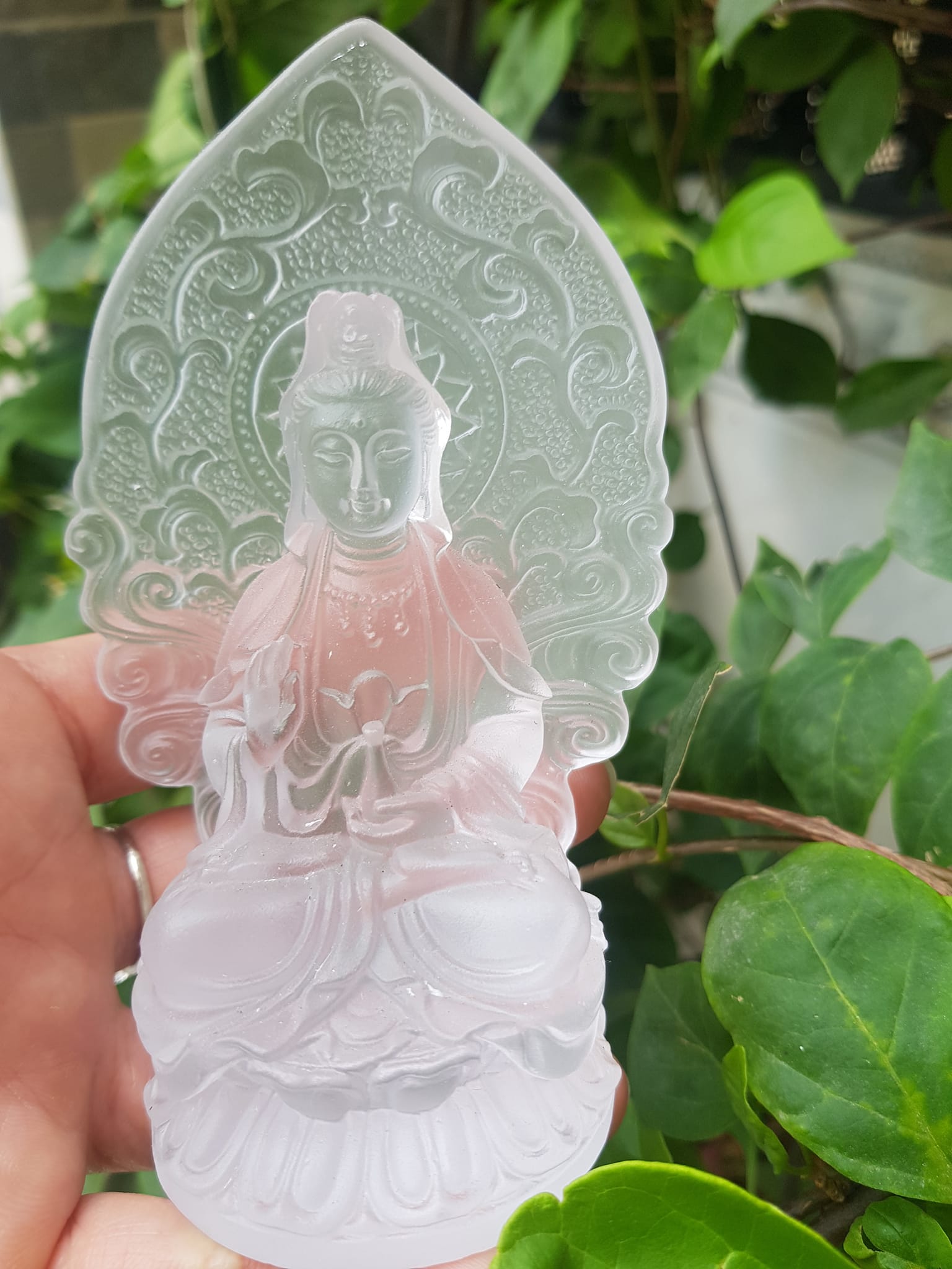 💐💐☘️TƯỢNG PHẬT BÀ QUAN ÂM MỚI ĐÁ LƯU LY TRẮNG TINH ĐỂ TRONG XE HƠI hoặc BÀN cao 12cm x 7cm x đế 5cm