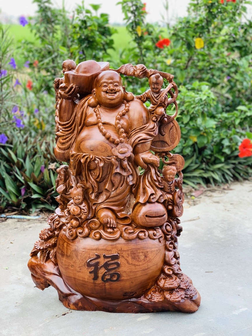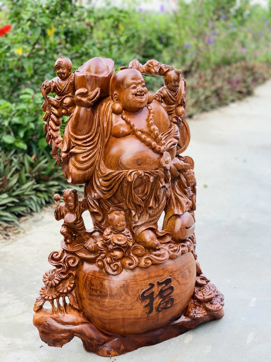 Tượng Phật Di Lặc Ngũ Phúc Gỗ Hương Việt Liền Nguyên Khối, rộng 83 cao 43 sâu 33 cm