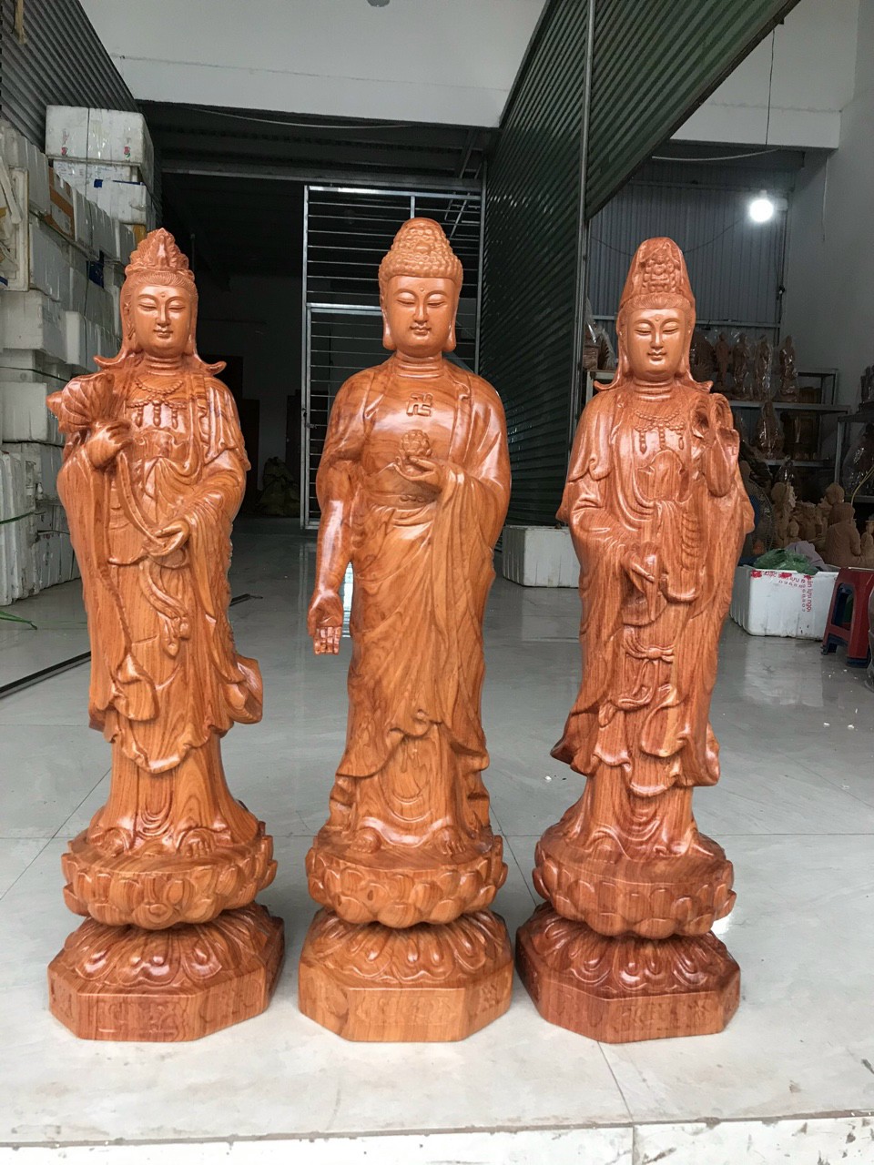 Cách lập ban thờ Tây Phương Tam Thánh. Bộ tượng Tam Thánh Phật đứng cao 60cm gỗ hương đá
