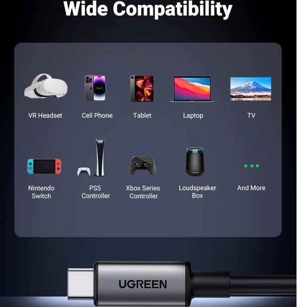 Cáp liên kết VR Ugreen 90629 USB C tương thích hoàn hảo với Oculus/Meta Quest 2/1, kết nối tai nghe VR với PC chơi game của bạn, cho phép bạn truy cập vào nhiều lựa chọn trò chơi Oculus Rift và ngày càng phát triển. Trò chơi Steam VR, mang đến cho bạn trải nghiệm chơi game VR thú vị.