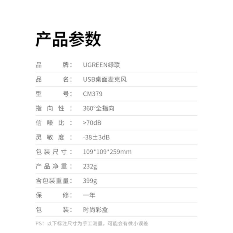 1. Thương Hiệu : UGREEN 2. Mã : 10934 - CM379 3. Loại : Micro để bàn 4. Chiều dài cáp : 1M 5. Màu : Đen 6. Chuẩn kết nối : USB 7. Chất