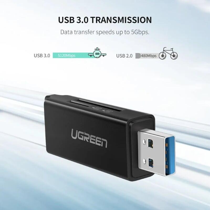 Ugreen 40753 usb 3.0 to tf + sd card readerdual card dual read white cm104 1. Input : USB 3.0 A Male 2. USB 3.0 and compatible with USB2.0 speeds up to 5Gbps 3. Output