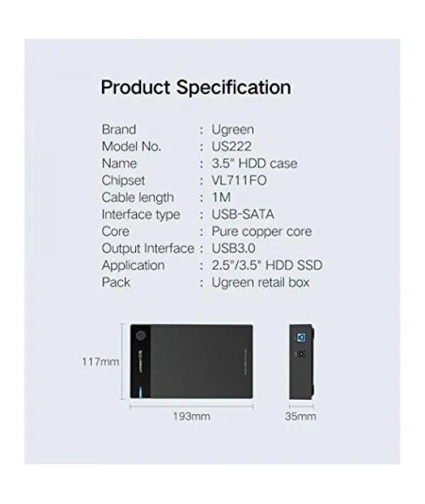 Ugreen 50422 usb 3.0 3.5 inch hard disk box black us222 1. Input:USB3.0-B Female adapter 2. Output:(7+15)Pin SATA port 3. Suppot UASP transport protocol 2. Support SATA 3.0 compatible with SATA 2.0/SATA 1.0 4. Support