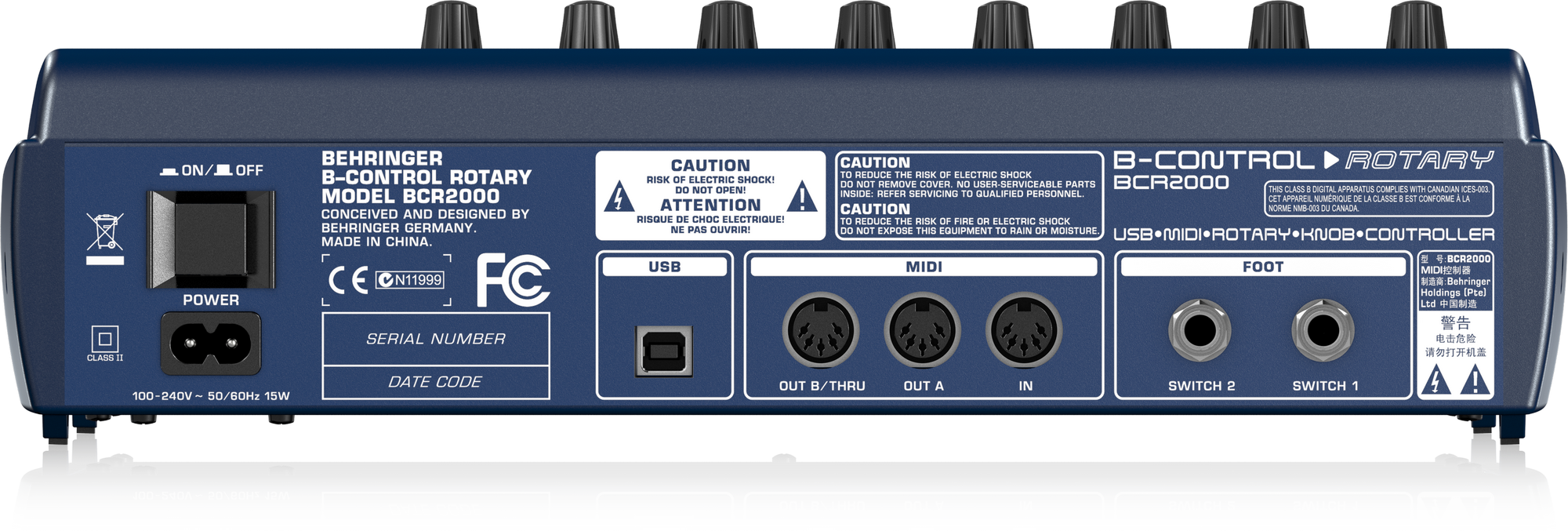 B-CONTROL ROTARY BCR2000 The total-recall B-CONTROL BCR2000 USB/MIDI Controller combines the unlimited versatility of today’s audio software with the feel of real handson controls. With the BCR2000 you can move real high-resolution encoders to control all of your computerbased virtual gear in Cubase, Cakewalk, Logic Audio, Ableton – and many other popular DAWs (Digital Audio Workstations). Want to control your synth, mixer, effects or signal processor with real controls? It's amazingly simple to set up the BCR2000 to help you perform myriad tasks, all of which were never intended to be done with a mouse!         More Than Just a Pretty Set of Knobs Sure, the B-CONTROL BCR2000 has 32 supercool rotary encoders for ultra-easy control of your virtual mixers, organ-drawbars, synths and samplers, but it has so many more features that will make this little marvel your go-to USB/MIDI controller – for everything. Full MIDI In/Out/Thru capability and 32 endless rotary encoders, each with a15-element LED indicator. Eight of these encoders have a special push-to-set function allowing you to select, adjust and control an endless array of functions. Assign a dedicated knob or button to your most frequently used functions and make edits, all without ever touching a mouse. Tweak “front panel” settings by simply turning a knob. It’s like having the real knobs for every control on your computer screen. Best of all, you'll discover things you can do with MIDI you never thought of before! Simple Setup Simply connect your B-CONTROL to your computer via USB. Then assign and control MIDI/audio sequencers, software mixers or virtual synths/plug-ins with real knobs and faders – without using your mouse! You’ll spend less time clicking around, and more time enjoying your music! Hardware Enhancement for Your Digital Workflow Bridging the gap of the analog/digital divide, the BCR2000 gives you command over all your virtual gear in programs like Cubase, Cakewalk, Logic Audio, Ableton, and a multitude of other major audio software apps. While computer-based music creation has done much to eliminate the need for hardware, it has left a big void in the realm of tactile, real-time control – a void the BCR2000 is more than happy to fill! All Hands on Deck The incredible BCR2000 is an innovative control surface with a total of 32 rotary encoders for the ultimate control of virtual synths, samplers, effects and signal processors. How about more intuitively controlling your synth or MIDI expander? With the BCR2000 controller this is reality – intuitive control with a real hands-on feel! Unlike using a mouse, the BCR2000 allows you to make multiple adjustments simultaneously – as many as your fingers will allow. Get your hands back into your music with the amazing B-CONTROL BCR2000 today Additional drivers and editor/librarian software available for free download Generic USB MIDI support with Windows XP (or higher) and Mac OS X operating systems Easy connection to any computer/expander, etc. using standard MIDI In/Out connectors MIDI Input with merge function for cascading several control units Multi-function, 4-digit LED display with real-time parameter indication plus write-in fields for your own labeling 1 MIDI In plus 2 MIDI Outs, usable as an additional USB to MIDI interface Configurable MIDI and USB modes for ultra-flexible system integration 32 user presets each with 4 encoder groups Two additional multi-function foot switch connectors can be used  all types of MIDI data All panel elements freely assignable—manually or via user-friendly learn mode 16 + 4 illuminated buttons freely assignable to all types of MIDI functions from note on/off, control change and program change to MMC and system exclusive data