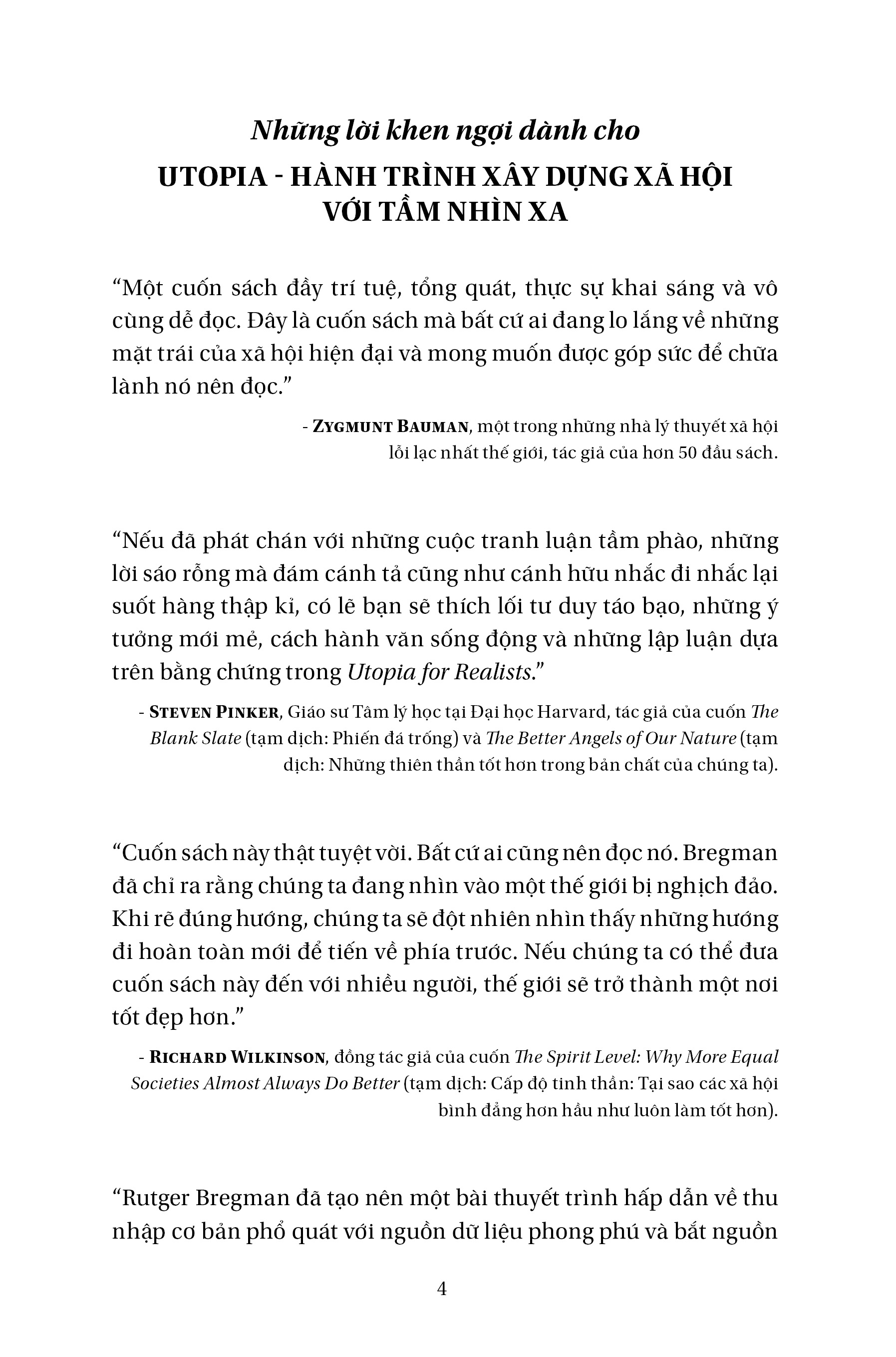 Những quan điểm mới của tác giả - nhà sử học xuất sắc nhất châu Âu hiện nay Tác giả: Rutger Bregman Rutger Bregman là nhà tư tưởng thế hệ mới, quan điểm lí luận của anh đã phá vỡ hệ tư tưởng nặng nề tồn tại suốt 40 năm qua, đồng thời cũng phá vỡ quỹ đạo cuộc sống xã hội ngột ngạt hiện tại. Những quan điểm lí luận đó được thể hiện rõ nét trong Utopia – Hành trình xây dựng xã hội với tầm nhìn xa. Trong cuốn sách này, Rutger Bregman đã phân tích, lí giải hàm ý của Utopia, thuật lại quá trình nảy sinh ra tư tưởng Utopia trong lịch sử và cả ý nghĩa tích cực cũng như tính tất yếu của xã hội. Nghèo đói, bất công, những điều này đều khơi dậy khao khát của con người đối với “Miền đất của sự dư thừa” (The Land of Plenty), đồng thời nỗ lực hết mình để đạt được điều đó. Trong thực tiễn chính trị xã hội hiện đại cũng tồn tại một vài trải nghiệm mang màu sắc Utopia, ví như “Dự luật thu nhập cơ bản” của cựu tổng thống Mỹ Richard Nixon. Quan niệm dẫn dắt hành động, và nếu chúng ta kiên trì thực hiện hành động trong thời gian dài thì nó sẽ trở thành hiện thực. Đây cũng chính là ý nghĩa của Utopia. Bregman chỉ ra rằng, muốn thay đổi thế giới, chúng ta phải có những suy nghĩ “không tưởng” mang tầm nhìn xa, những suy nghĩ mà trong thời đại chúng ta sống bị đánh giá là viển vông. Trước đây những người đề xướng ra chế độ bãi bỏ nô lệ, chế độ đề cao nữ quyền… cũng từng bị cho là “mất trí”, nhưng sau đó lịch sử đã chứng minh quan điểm của họ là đúng đắn, có tầm nhìn xa trông rộng. Và ở đây, Bregman đã đề xướng ra ba ý tưởng “kì lạ”: 1. Mỗi người dân đều có thu nhập cơ bản để đảm bảo cuộc sống tối thiểu mà không cần điều kiện đi kèm. 2. Rút ngắn thời gian làm việc xuống còn 15 giờ mỗi tuần. 3. Mở cửa biên giới các nước để người dân có thể tự do đi lại bất cứ nơi nào họ muốn. Ngày nay, khi khoảng cách giàu nghèo, khoảng cách giữa công việc lý tưởng và công việc thực tế ngày càng bị kéo dãn, thì ba ý tưởng này đã sắp xếp lại nguồn lực của từng cá nhân, của xã hội và của cả thế giới. Vấn đề thu nhập cơ bản cho toàn dân không còn là giấc mơ, mà trở thành thực nghiệm xã hội đang được tiến hành tại một số quốc gia tiến tiến ở châu Âu, trong cuốn sách cũng đưa ra các ví dụ điển hình đã thực hiện thành công (như Canada, Phần Lan, Hà Lan, Thụy Sỹ) Đối diện với sự biến động và bất công của thế giới hiện tại, khi mà chính phủ hoặc các chính đảng cũng không thể hứa hẹn hay đảm bảo tương lai cho người dân, thì Bregman dẫn dắt độc giả đến với luồng tư tưởng mới: Phát triển là gì? Tiến bộ là gì? Giá trị đích thực của cuộc sống là gì? Cuốn sách đã tạo ra một sức ảnh hưởng vô cùng lớn lao, Rutger Bregman không chỉ làm dấy lên làn sóng dư luận liên tục và lâu dài trong giới truyền thông, mà còn thúc đẩy các hoạt động rộng khắp Hà Lan nhằm thực hiện quan điểm mà anh đưa ra trong cuốn sách. Cuốn sách nói với chúng ta rằng bắt đầu từ những hành động nhỏ, chúng ta có thể từ từ thay đổi được thế giới. Cuốn sách cũng nói rằng ước mơ là một điều rất kì diệu, nó ẩn chứa sức mạnh thay đổi thế giới, dẫu cho nó có hoang đường đến đâu. Cuốn sách còn nói bất kể bạn là ai, thuộc tầng lớp nào, bạn đều có thể biến những điều “không thể” thành điều ‘có thể”. Bởi những điều như thế đã từng xảy ra trong quá khứ nên chắc chắn nó hoàn toàn có khả năng sẽ xảy ra trong tương lai. Utopia – Hành trình xây dựng xã hội với tầm nhìn xa là tác phẩm tràn đầy nhiệt huyết của một nhà sử học tài hoa, là ngôn ngữ đầy lương tri trong xã hội còn nhiều bất cập. Với phong cách viết sống động, linh hoạt, với các luận chứng, luận cứ xác đáng, đầy sức thuyết phục và với tư tưởng sắc bén, nhanh nhạy, Rutger Bregman đã tiến hành quan sát và phân tích những vấn đề trọng đại về sự phát triển của xã hội cũng như tương lai của nhân loại một cách hết sức mộc mạc mà thực tế. Cuốn sách nhận được đánh giá cao từ giới học thuật, giới trí thức, cũng như giới xuất bản – truyền thông. Đồng thời cuốn sách còn nhận được sự khẳng định và những lời giới thiệu rất nhiệt tình đến từ các học giả, tác giả đi trước. Điều này không hề khó hiểu bởi Rutger Bregman đã viết sách với quan điểm mới mẻ, lập trường sắc bén, văn phong độc đáo, cùng với đó còn bao hàm tinh thần chủ nghĩa lí tưởng và thái độ của chủ nghĩa hiện thực phê phán. “Cuốn sách này không nỗ lực để dự đoán tương lai mà đang nỗ lực để mở khóa tương lai, để khai mở tâm trí của chúng ta.” Và bởi thế, nếu bạn không muốn bị nhấn chìm trong công việc, nếu bạn muốn giành lấy chủ quyền cuộc đời mình, nếu bạn muốn nhìn
