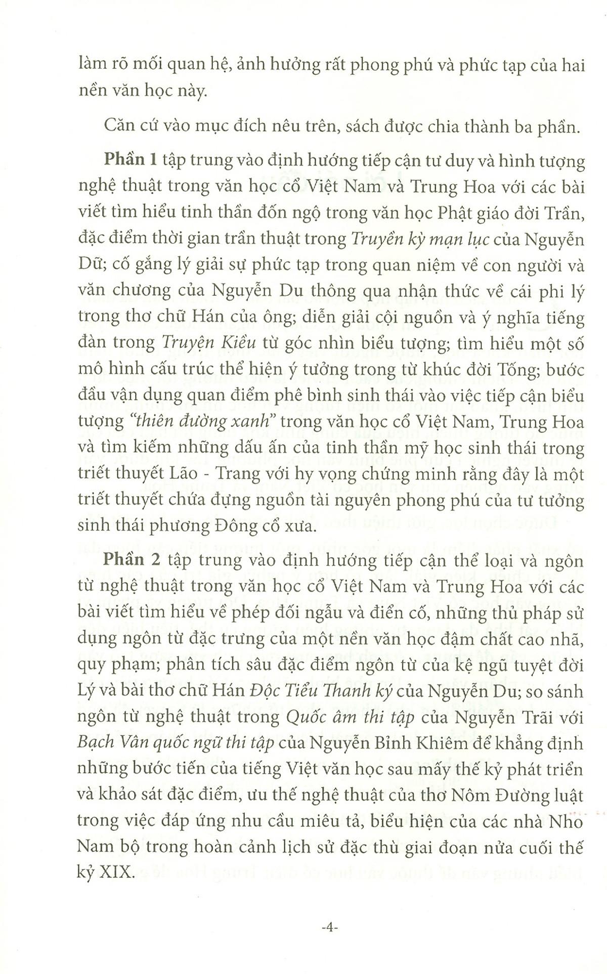 Cuốn sách này tập hợp một số bài báo và tham luận đã đăng trên các tạp chí khoa học chuyên ngành hoặc các kỷ yếu hội thảo khoa học, được người viết thực hiện trong 10 năm gần đây. Điểm chung của các bài viết là đều hướng tới mục đích tìm hiểu, khảo sát một số hiện tượng văn học nhằm chứng minh mức độ tương thích, hiệu quả cũng như khả năng tới hạn của các lý thuyết nghiên cứu phê bình văn học phương Tây khi được vận dụng vào nghiên cứu văn học cổ Việt Nam và Trung Hoa.