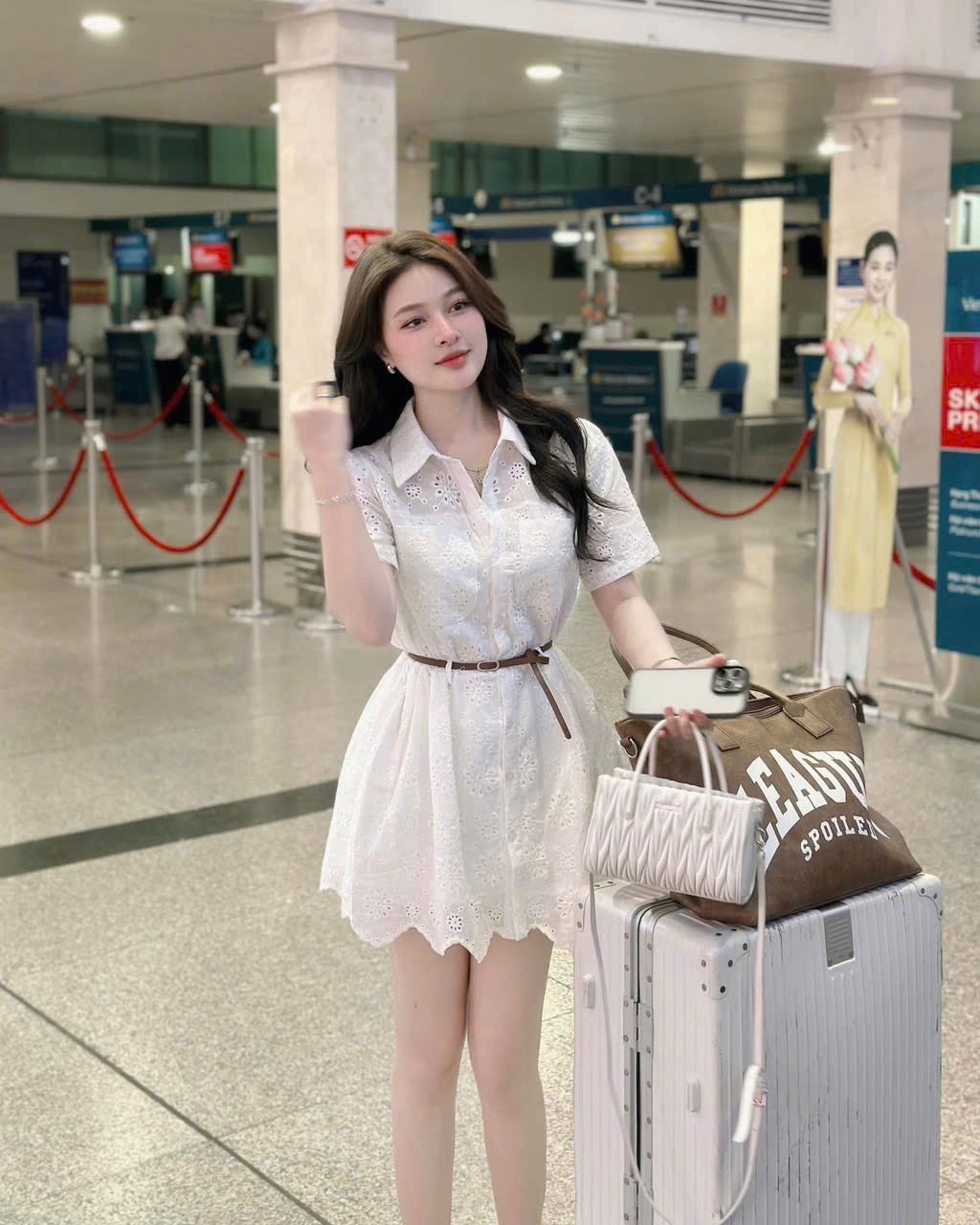 - Phom váy dáng suông, tặng kèm đai da nâu tây. Tạo phong cách thời trang độc đáo.