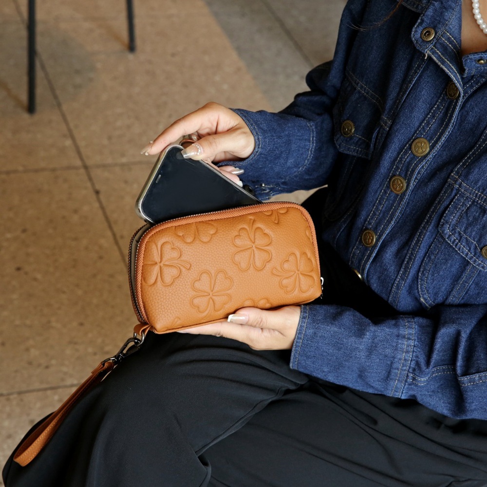 Mua tại TiktokKích thước: Chiều cao 13.0cm x Chiều ngang 21.0cm x Chiều rộng 4.0cm Ví cầm tay có dây đeo tay tháo rời được Có hai vách ngăn đựng thẻ và điện thoại Dây khóa kéo