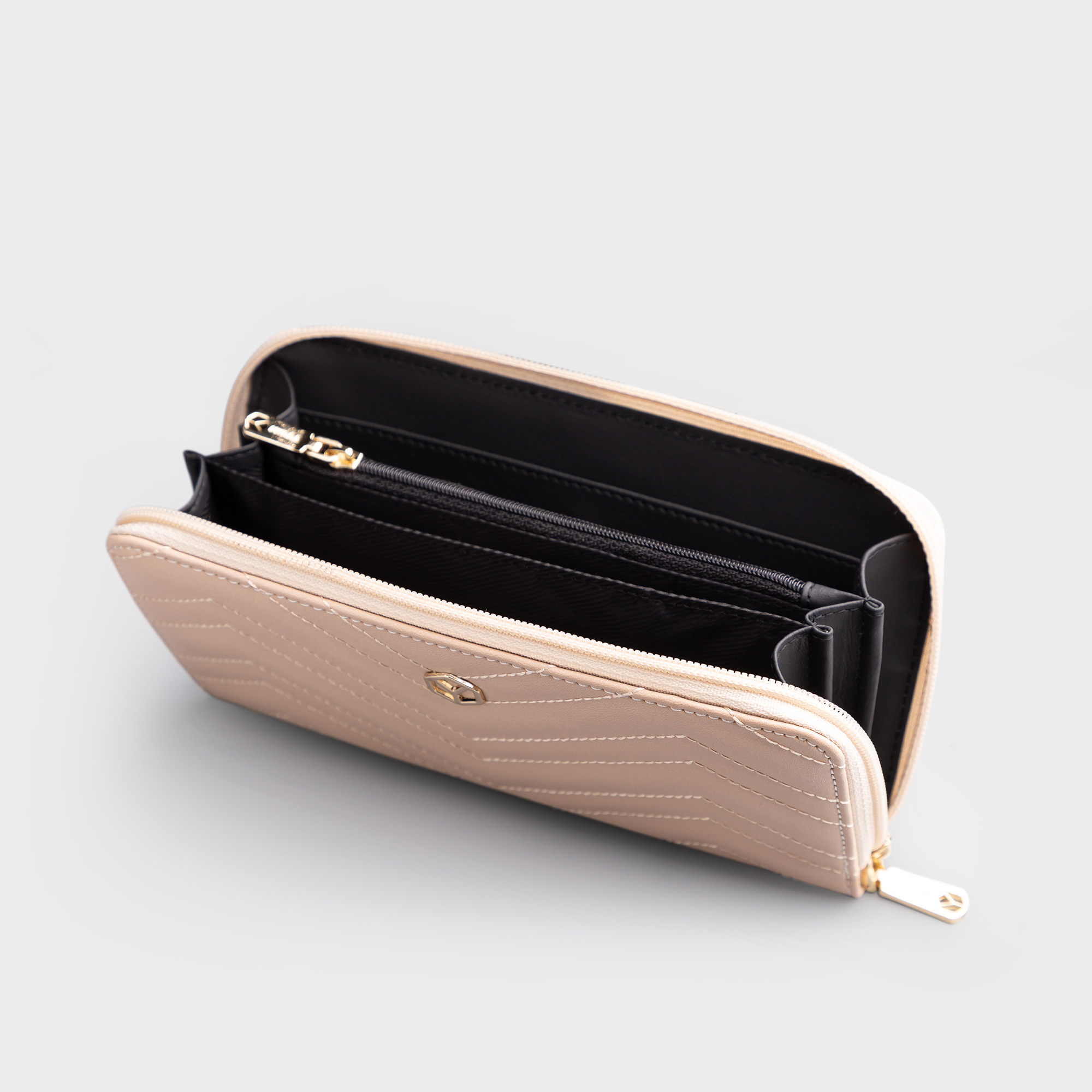 Kích thước: Chiều cao 13.0cm x Chiều ngang 21.0cm x Chiều rộng 4.0cm Ví cầm tay có dây đeo tay tháo rời được Có hai vách ngăn đựng thẻ và điện thoại Dây khóa kéo