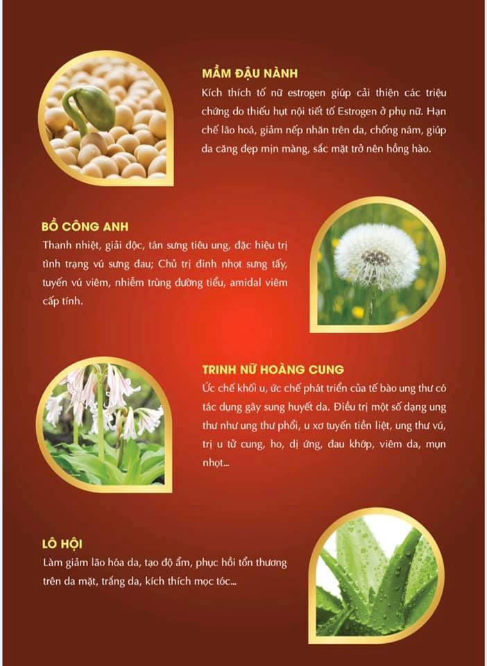 - Phòng ngừa và làm chậm quá trình lão hóa, giúp duy trì nhan sắc thời thanh xuân, tăng kích thước và độ săn chắc của vòng 1, giảm mỡ vùng bụng và các cơ quan nội tạng, làm giảm các dấu hiệu lão hóa như nám, tàn nhang, sạm da, da nhăn, tóc khô, vết chân chim, mỡ thừa, trả lại cho phụ nữ làn da căng mịn, đàn hồi, trắng sáng.