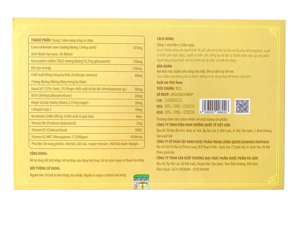 - THÀNH PHẦN Bột đông trùng hạ thảo (cordyceps sinensis): 900mg Glucosamine sulfate potassium chloride: 600mg Shark cartilage (sụn cá mập): 450mg Aquamin F (tương đương canxi 70,4mg): 220mg Canxi carbonat nano (tương đương canxi 80mg): 200mg MSM (Methylsufonylmethane): 100mg Magnesium lactat: 60mg Collagen tuýp II: 30mg Bromelain (chiết xuât từ quả dứa): 15mg Nano curcumin: 15mg Vitamin K2 (menaquinone 7-MK7) 2000ppm: 4500mcg Vitamin B6 (pyrdoxin HCl): 3mg Vitamin D3 (Cholecalciferol): 300IU Phụ liệu: Talc, magnesium stearat, tinh bột vừa đủ.