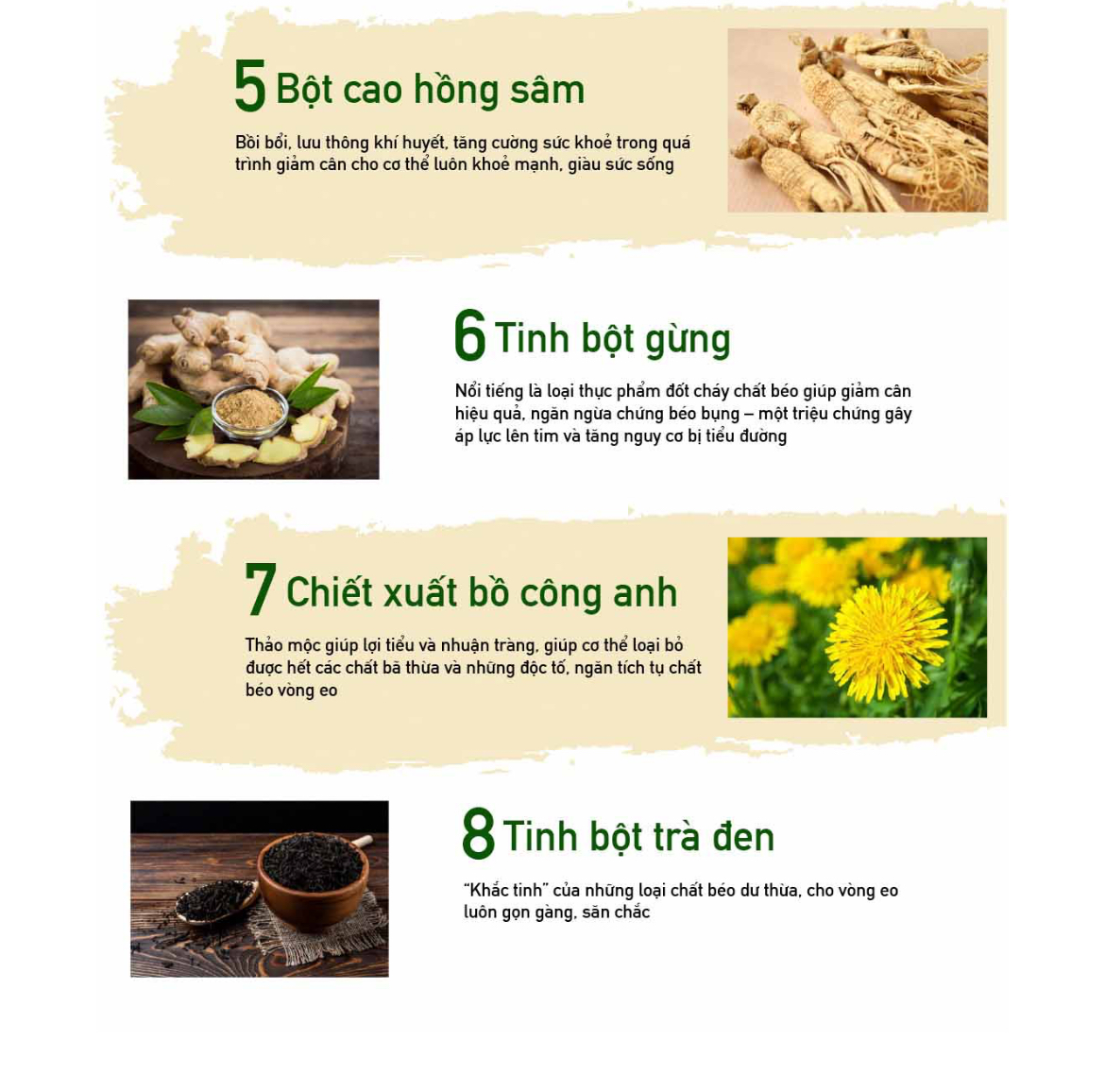 Công dụng chính: Tăng cường trao đổi chất, tăng sinh nhiệt, đốt cháy mỡ thừa mới và mỡ thừa lâu năm khó tiêu hủy. Tăng cường năng lượng bổ xung vitamin và khoáng chất.