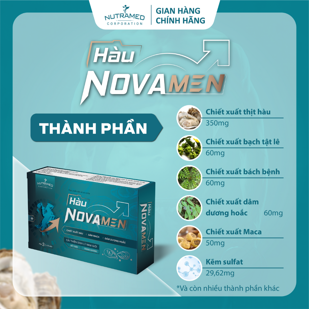 Hàu Novamen - Giải pháp hỗ trợ bổ thận, tráng dương, hỗ trợ cải thiện s.i.n.h l.ý nam THÀNH PHẦN ️ Chiết xuất thịt Hàu (Oyster extract powder); Chiết xuất Bạch tật lê (Tribulus