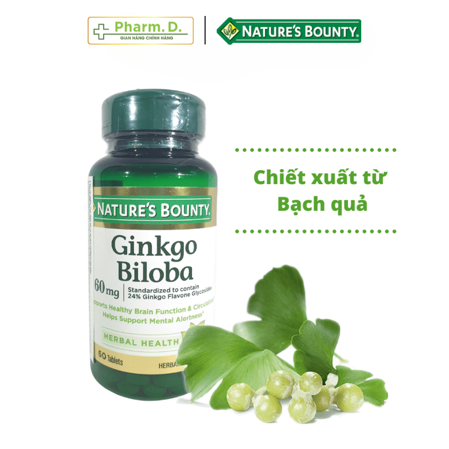 Viên Uống Hỗ Trợ Bổ Não, Cải Thiện Trí Nhớ NATURE'S BOUNTY Ginkgo Biloba Supports Healthy Brain Viên Uống NATURE'S BOUNTY Ginkgo Biloba Supports Healthy Brain Hỗ Trợ Bổ Não, Cải Thiện Trí Nhớ (60 Viên) là sản phẩm nổi tiếng đến từ thương hiệu Nature's Bounty được sản xuất tại Mỹ. Với thành phần chiết xuất tự nhiên từ Lá Bạch Quả - Ginkgo có tác dụng bồi bổ cho trí não, tăng khả năng lưu thông máu lên não được tốt hơn. Ngoài ra, Ginkgo Biloba 60mg còn bảo vệ các tế bào ở hệ thần kinh trung ương, tăng tính chịu đựng của mô não khi thiếu oxy và chống oxy hóa của các gốc tự do có hại. Thương hiệu: Nature's Bounty Xuất xứ: Mỹ Hạn sử dụng: Xem trên bao bì sản phẩm Quy cách đóng gói: Hộp 60 Viên THÀNH PHẦN VIÊN UỐNG BỔ NÃO GINKGO BILOBA: Trong mỗi viên Nature's Bounty Ginkgo Biloba 60mg sẽ chứa: