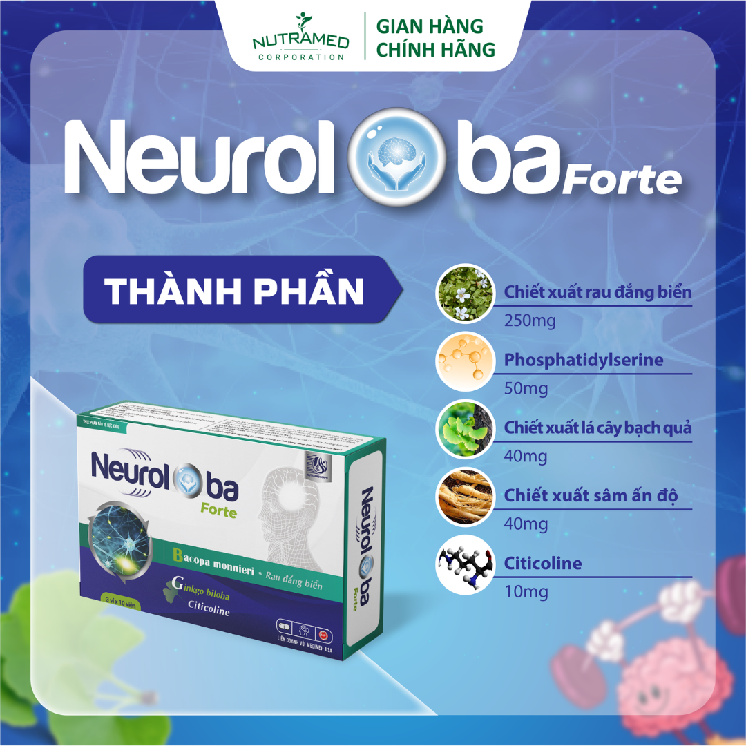 NEUROLOBA - Hỗ trợ tuần hoàn máu não, cải thiện các triệu chứng sau tai biến mạch máu não   THÀNH PHẦN ️Bacopa monnieri extract (cao chiết rau đắng biển Ấn Độ), Ginkgo biloba extract (cao chiết lá cây bạch quả), Phosphatidylserine, Withania somnifera extract (cao chiết sâm Ấn Độ), Citicoline, Tá dược.   CÔNG DỤNG ️Hỗ trợ tăng cường tuần hoàn máu não. ️Giúp cải thiện các triệu chứng hoa mắt, chóng mặt, tê bì chân tay, đau mỏi vai gáy, suy giảm trí nhớ do thiểu năng tuần hoàn não. ️Hỗ trợ cải thiện các triệu chứng sau tai biến mạch máu não do tắc mạch.   ĐỐI TƯỢNG SỬ DỤNG ️Người gặp vấn đề thiểu năng tuần hoàn não có triệu chứng các triệu chứng hoa mắt, chóng mặt, tê bì chân tay, đau mỏi vai gáy, suy giảm trí nhớ ️Người sau tai biến mạch máu não      HƯỚNG DẪN SỬ DỤNG ️Uống ngày 2 - 3 lần, mỗi lần 1 viên, uống sau khi ăn 1 - 2 giờ.    KHÔNG SỬ DỤNG TRONG TRƯỜNG HỢP ️Người mẫn cảm, kiêng kỵ với bất kỳ thành phần nào của sản phẩm. ️Trẻ em dưới 12 tuổi ️Phụ nữ có thai và phụ nữ đang trong kỳ kinh nguyệt ️Người có vết thương hở, đang bị chảy máu ️Người tăng huyết áp kịch phát, xuất huyết não ️Người vừa phẫu thuật, chuẩn bị phẫu thuật   LƯU Ý ️Người đang dùng thuốc tham khảo ý kiến của chuyên gia y tế trước khi dùng. ️Thực phẩm này không phải là thuốc, không có tác dụng thay thế thuốc chữa bệnh.   BẢO QUẢN  ️Nơi khô mát, tránh ánh nắng trực tiếp. Nhiệt độ không quá 30∘C. Tránh xa tầm tay trẻ nhỏ.   THÔNG TIN SẢN PHẨM Tên sản phẩm: Neuroloba Forte Quy cách: Hộp 3 vỉ x 10 viên Hạn sử dụng: 36 tháng Tiêu chuẩn: TCCS   _ NUTRAMED - KHƠI NGUỒN KHOA HỌC TỚI CUỘC SỐNG   Nhà máy đạt chuẩn WHO – GMP. Nguyên liệu được kiểm tra chất lượng khắt khe bởi nhà máy đạt chuẩn GMP.