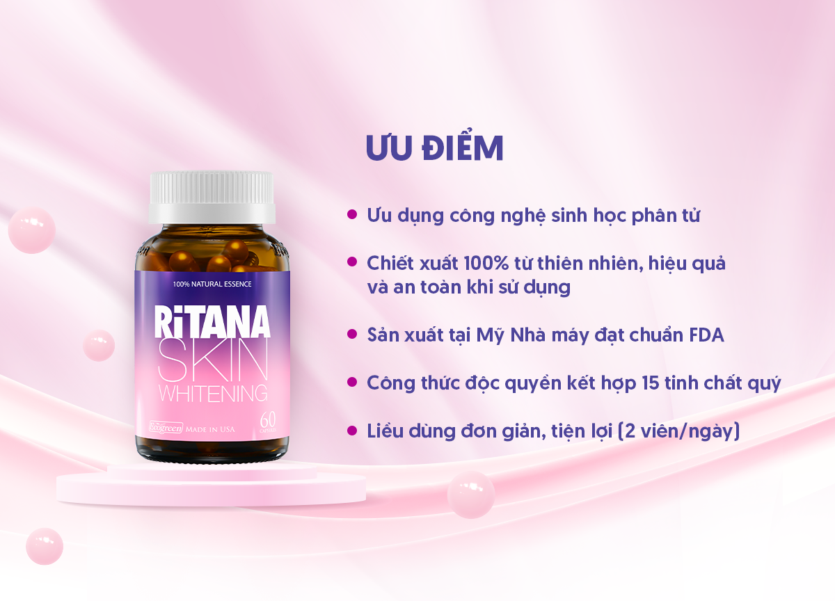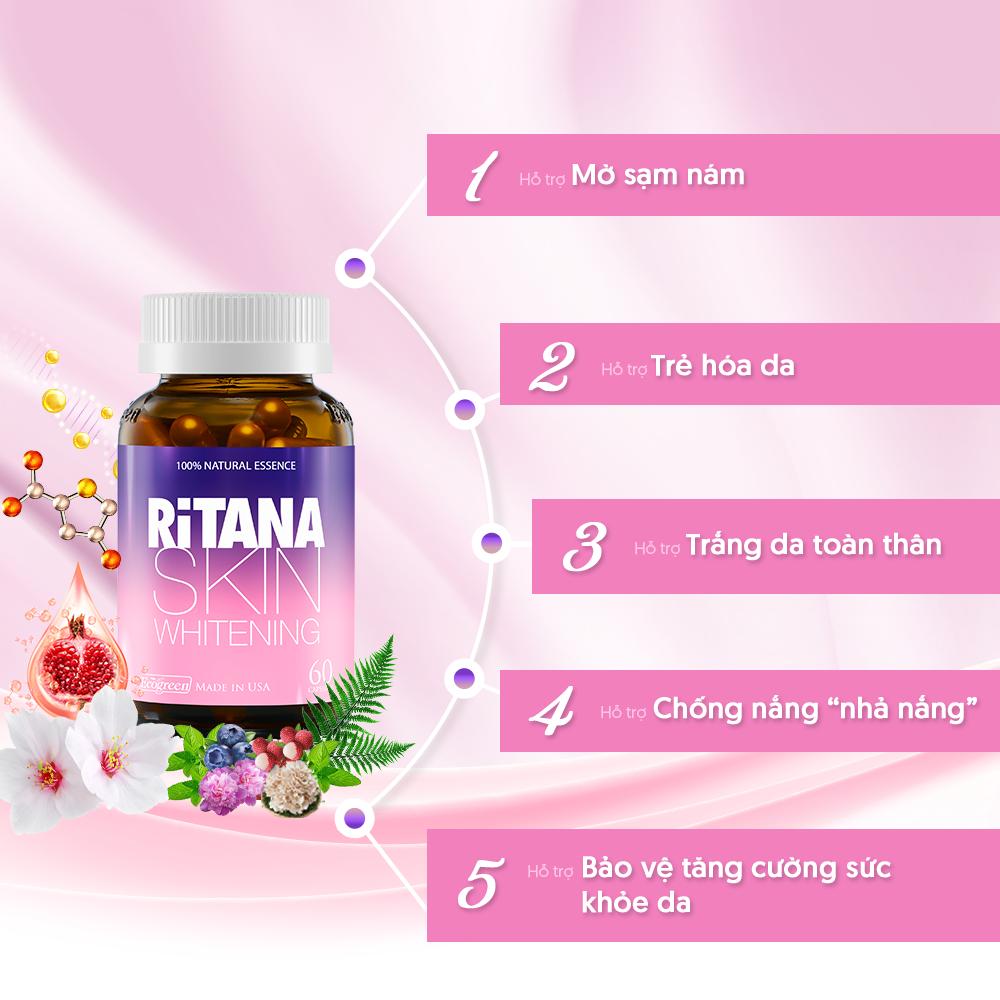 1. CÔNG DỤNG Công thức độc đáo của viên uống trắng da RiTANA chính là sự kết hợp những tính năng làm đẹp ưu việt từ các tinh chất thiên nhiên quý tác động đến